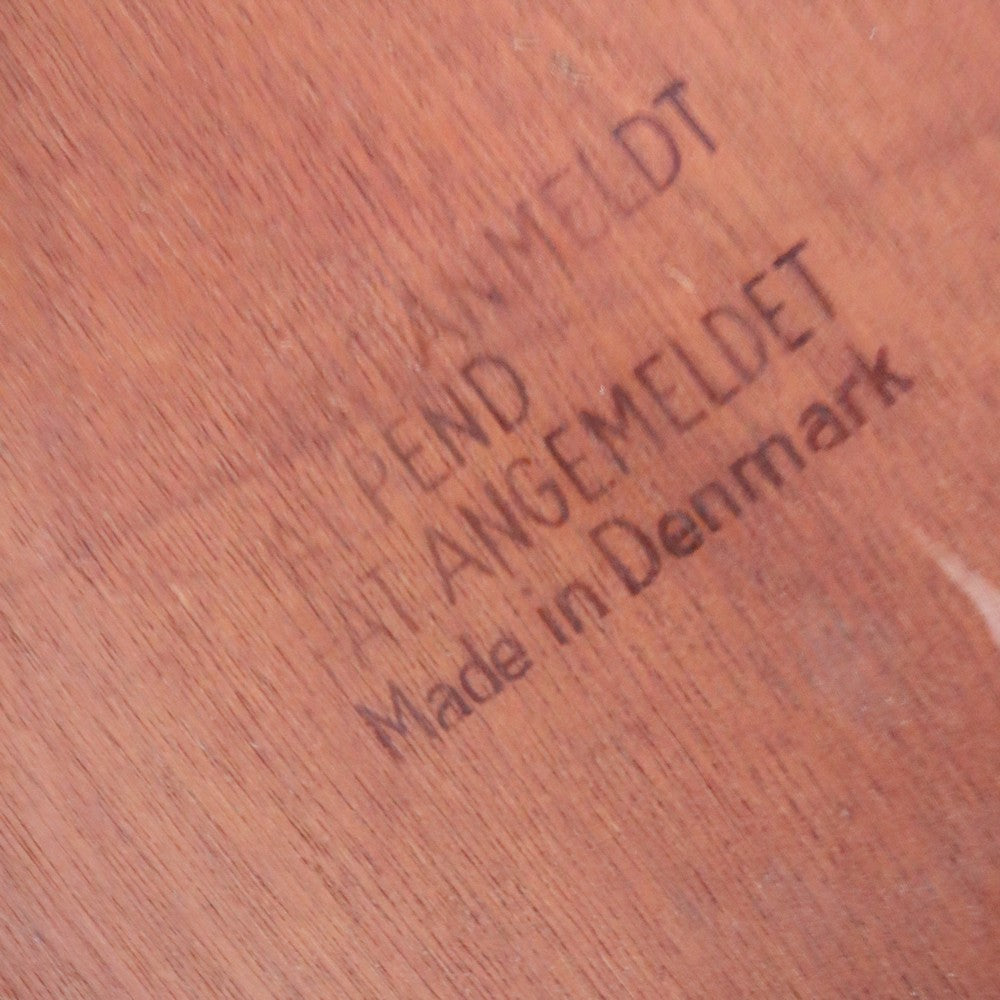 The table sits on a straight pedestal base with four legs, and still bears the original maker’s paper label. Additionally, the underside of the table is stamped with the patent mark and “Made in Denmark” — confirming genuine Danish mid-century provenance.