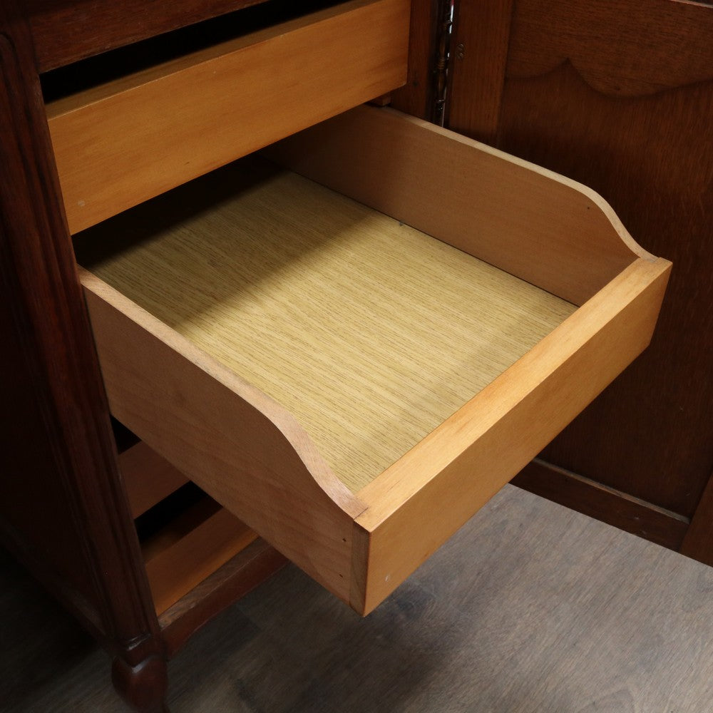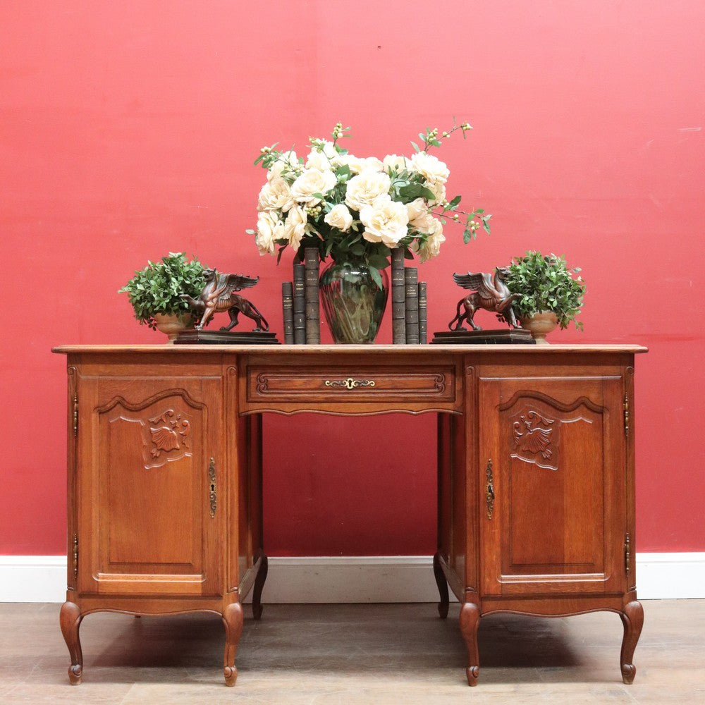 Description: A French oak office or study desk with a practical layout and attractive detail. The desk features a single drawer and two cupboards, one on each side of the user, offering convenient enclosed storage. The panelled sides and back allow the desk to be placed in the centre of a room, and the scalloped apron continues all the way around, adding elegance from every angle.