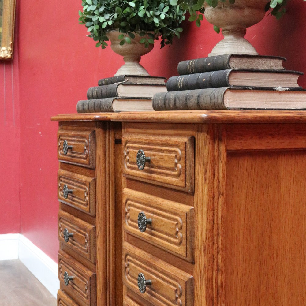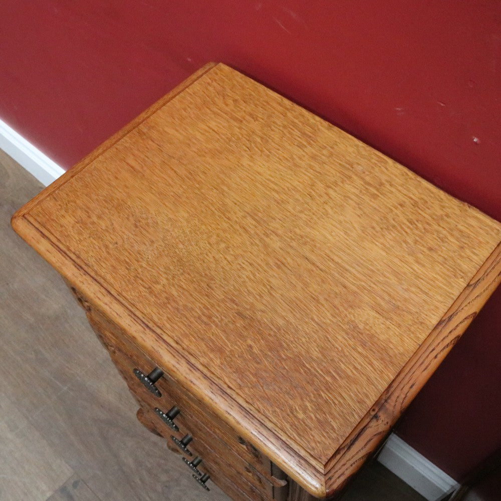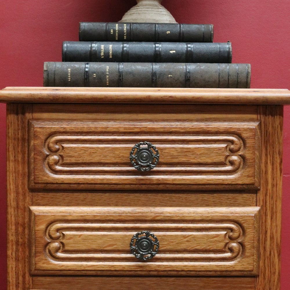 Description: A charming vintage French oak five-drawer lingerie chest with classic provincial styling. The drawers are decorated with carved motifs and gentle scrollwork to the sides, giving the piece a graceful, decorative presence. Gilt-metal handles with ornate fretwork surrounds add an elegant contrast to the warm oak grain.