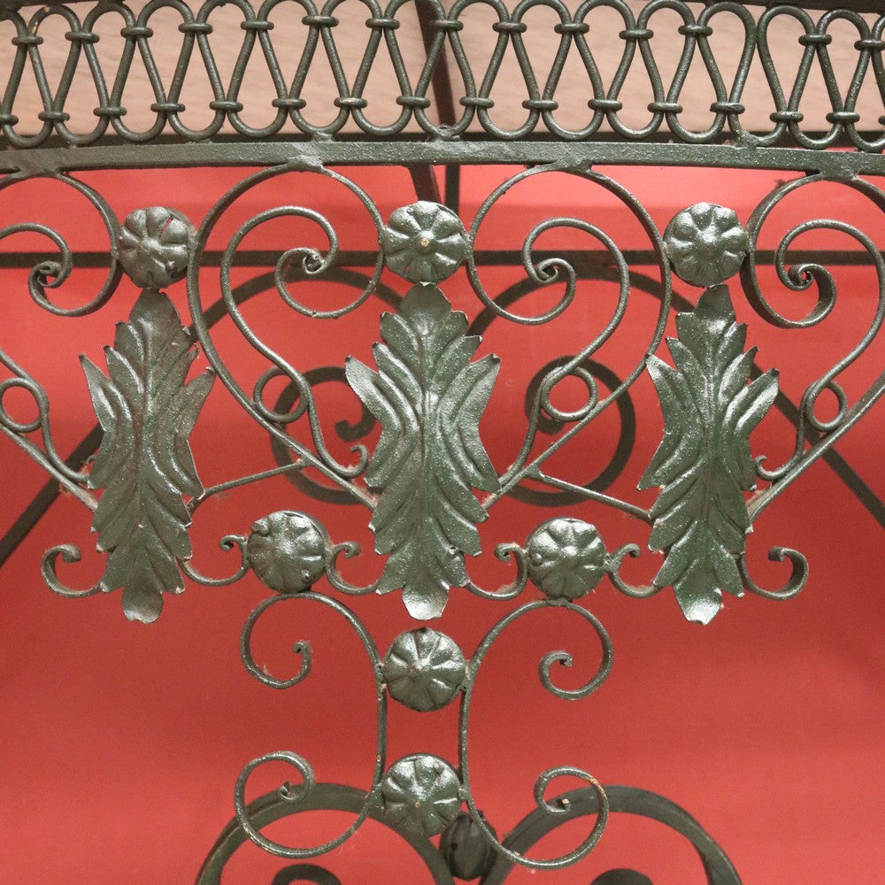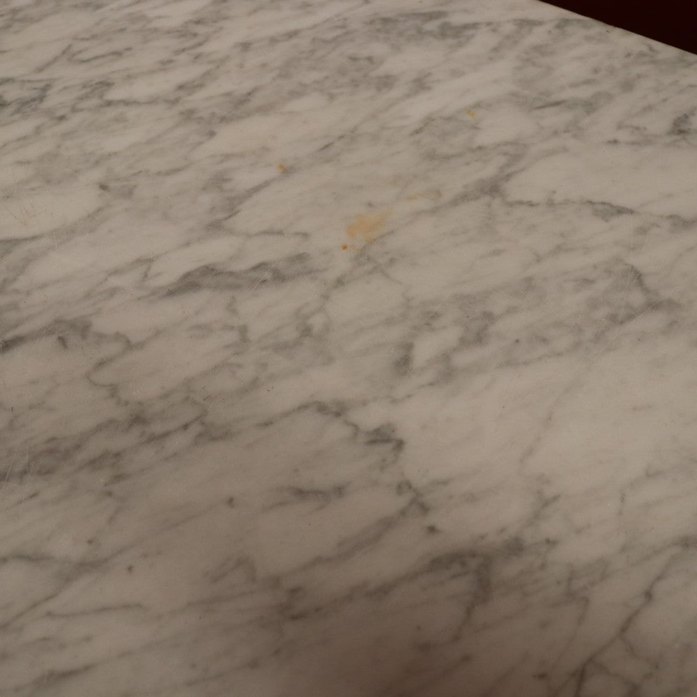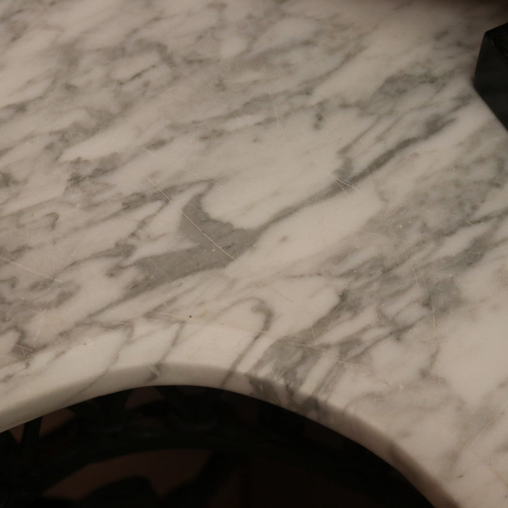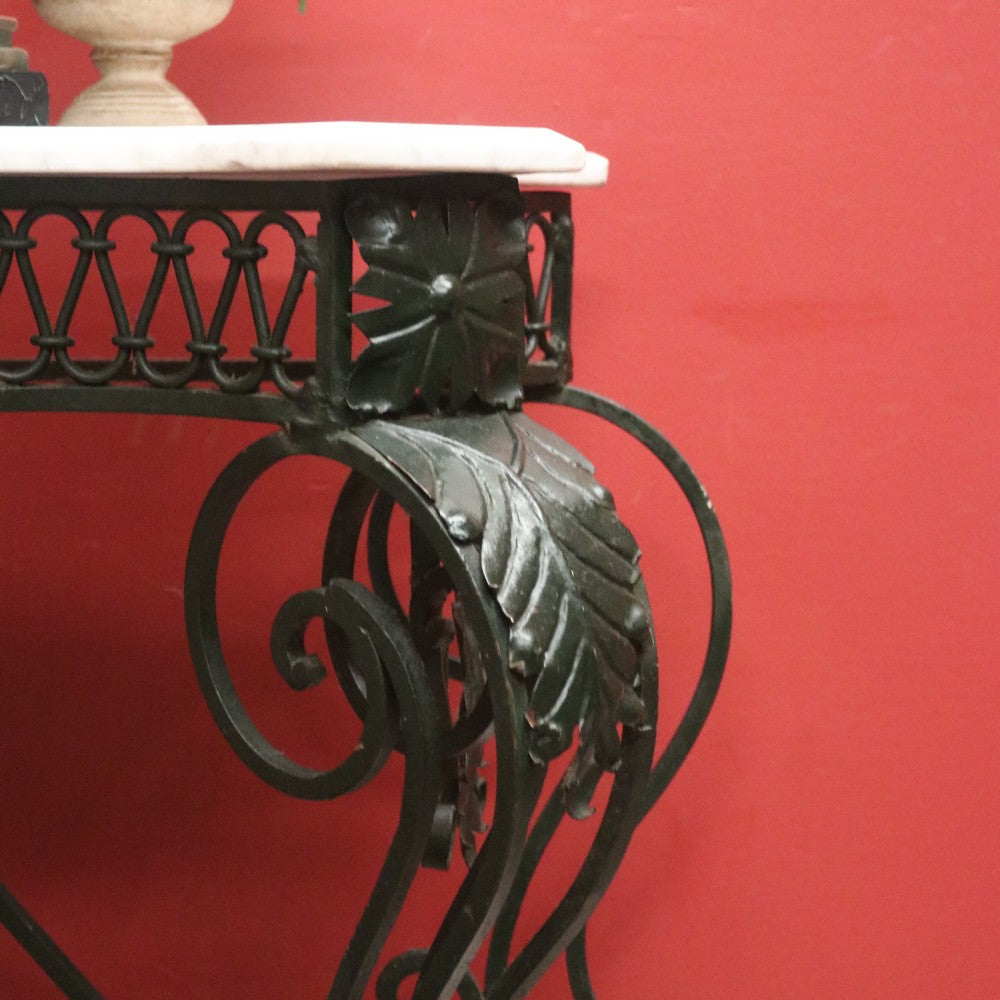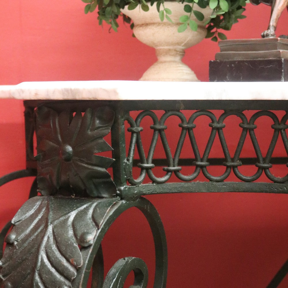 Description: Elegant French hall or console table with a white marble top featuring soft grey veining and a beautifully shaped edge. The wrought iron base, finished in a black-green tone, displays intricate scrollwork and leaf motifs throughout. A refined and decorative piece that adds character and charm to an entryway or living space.