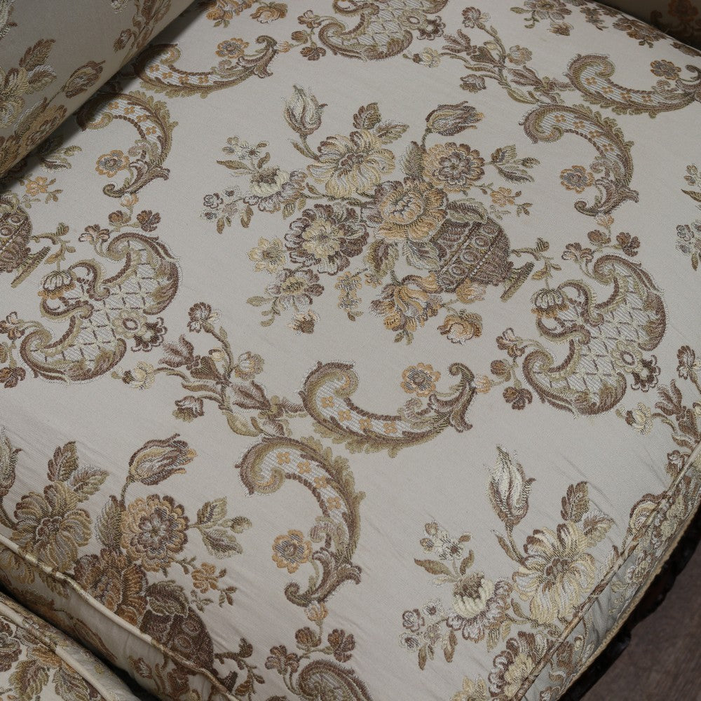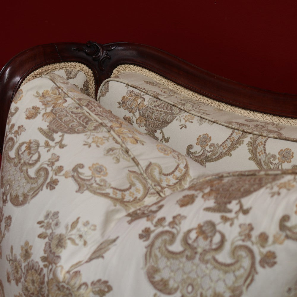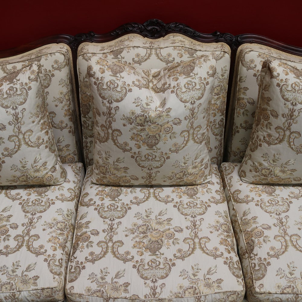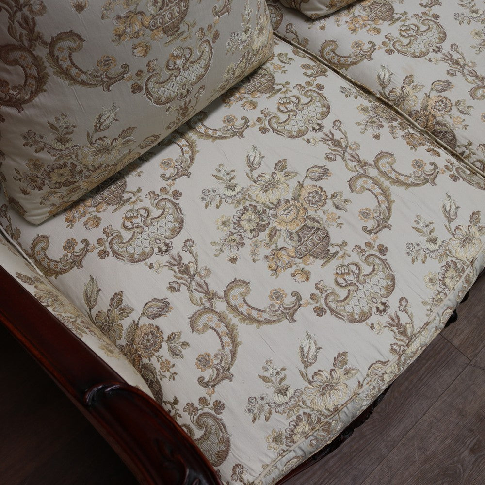 Upholstered in a cream ivory fabric with a floral and scrollwork pattern, the sofa includes feather-filled seat cushions and matching loose pillows for added comfort. A luxurious and elegant piece with presence and character.