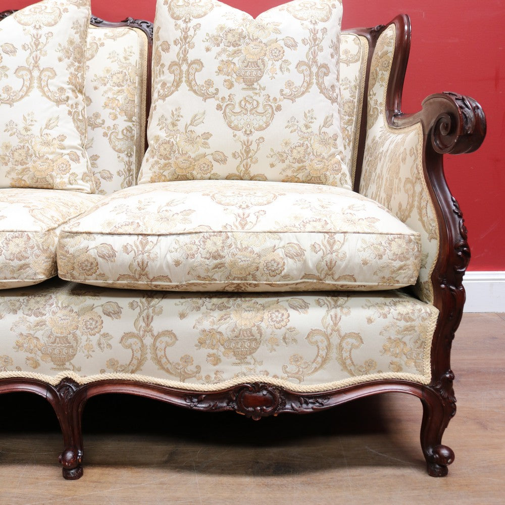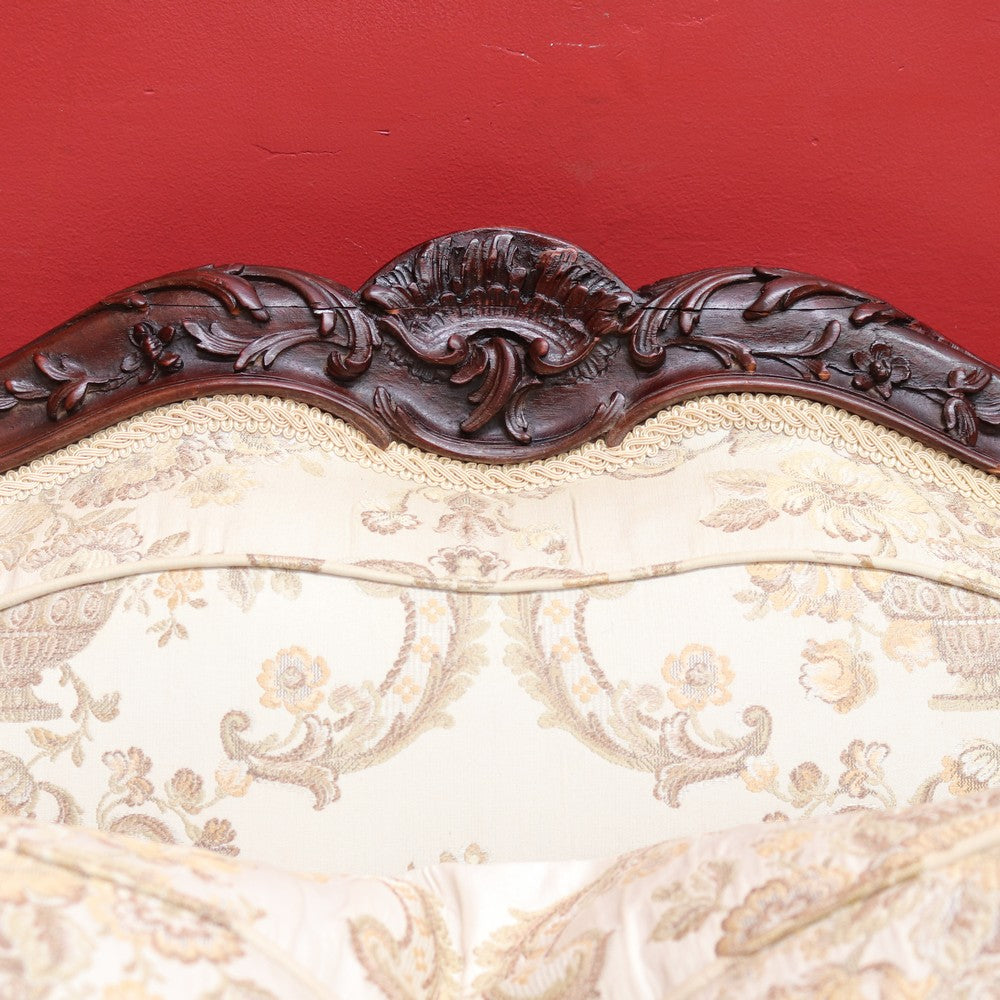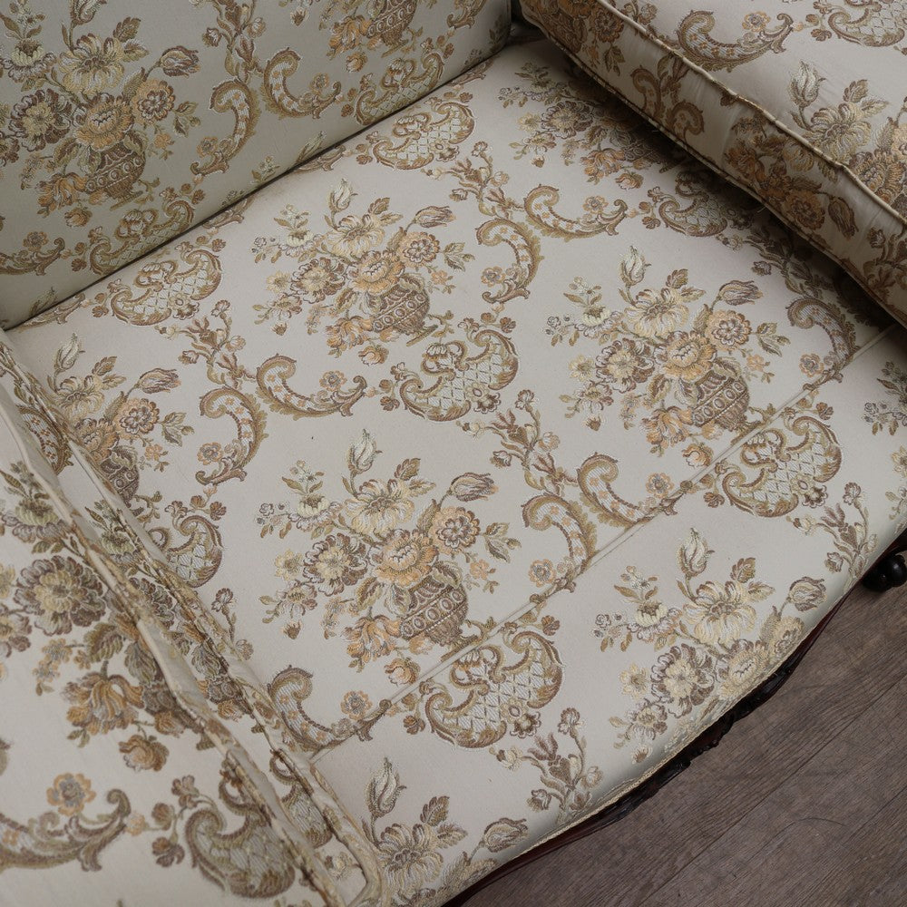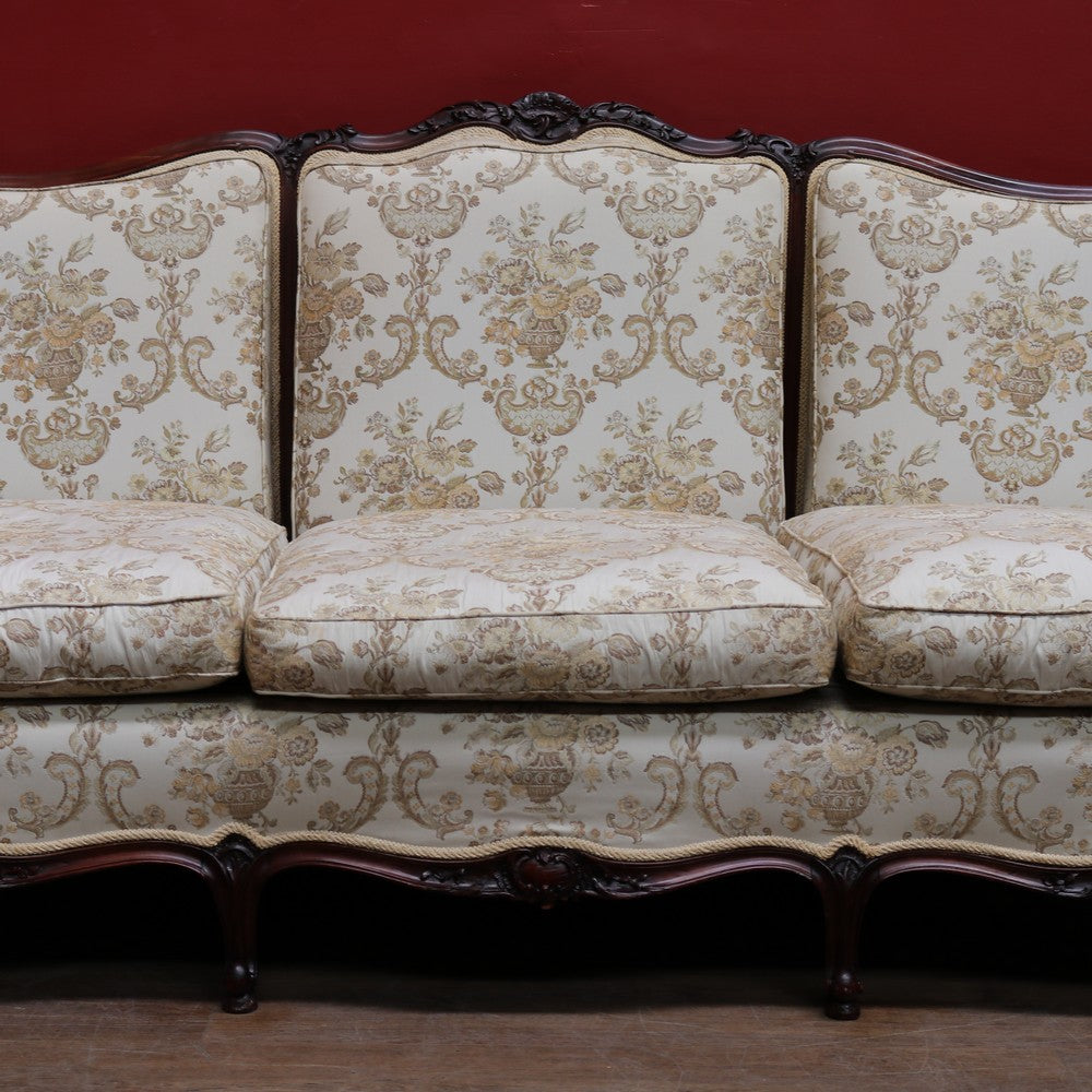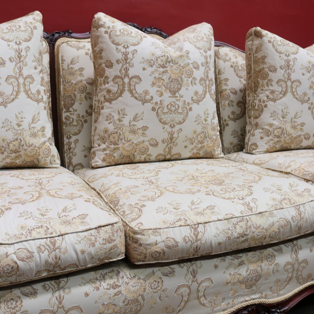Upholstered in a cream ivory fabric with a floral and scrollwork pattern, the sofa includes feather-filled seat cushions and matching loose pillows for added comfort. A luxurious and elegant piece with presence and character.