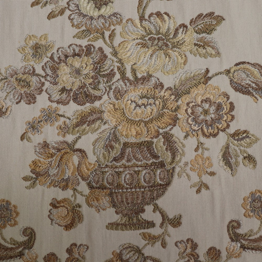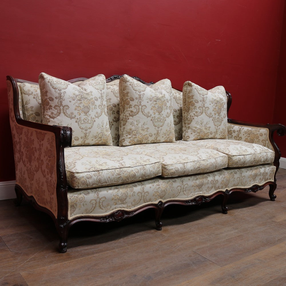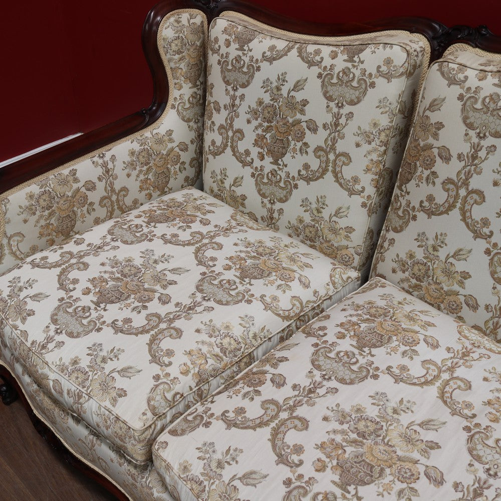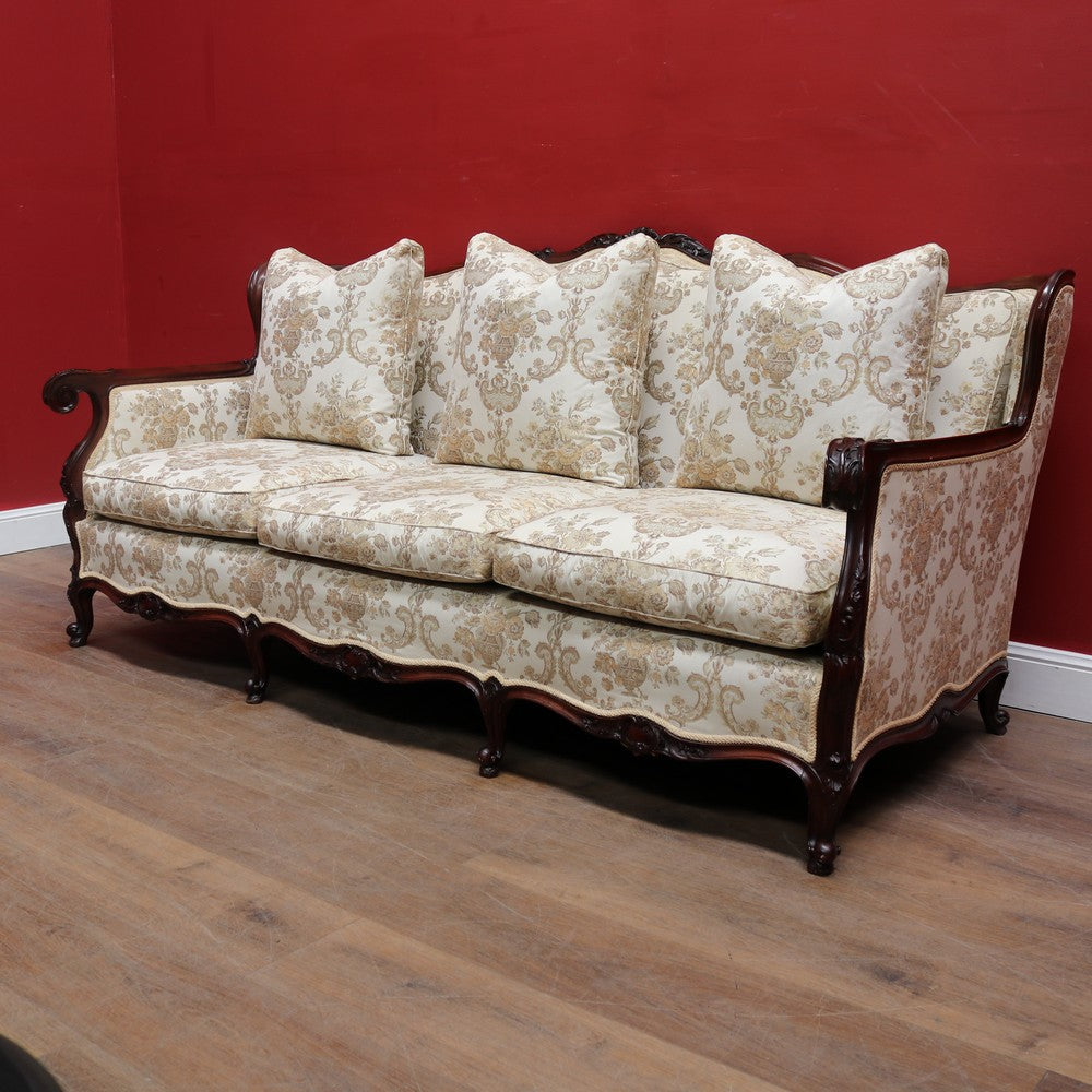 Upholstered in a cream ivory fabric with a floral and scrollwork pattern, the sofa includes feather-filled seat cushions and matching loose pillows for added comfort. A luxurious and elegant piece with presence and character.