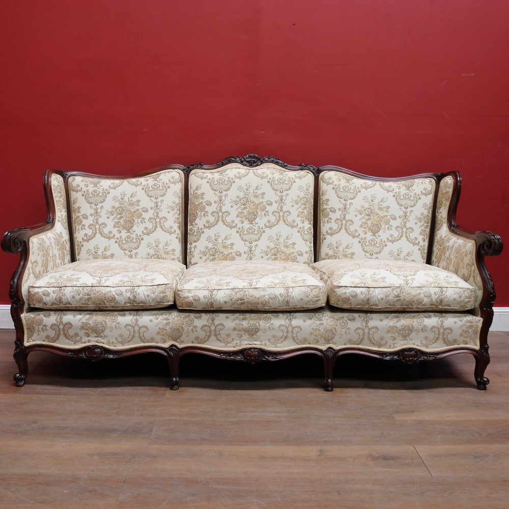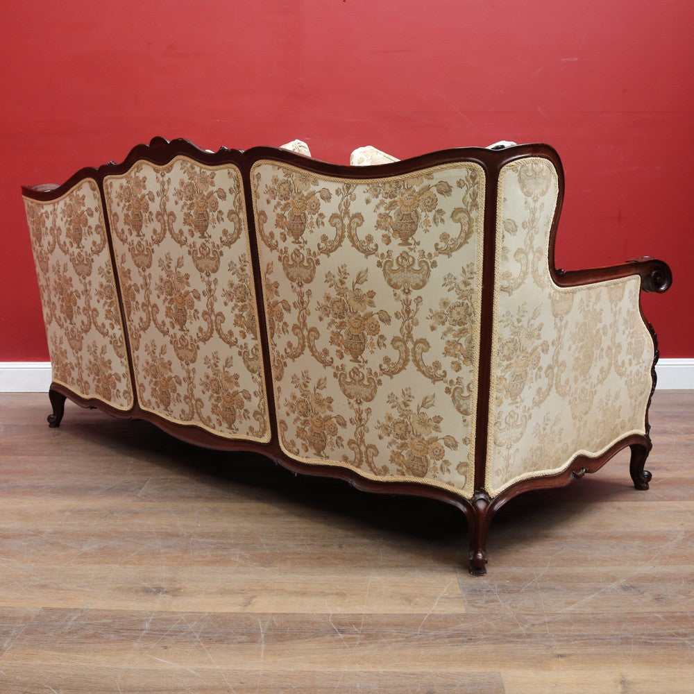 Description: An impressive and grand antique sofa in the Victorian or Rococo Revival style. The ornate walnut frame features a finely carved top crest rail and rich detailing throughout.