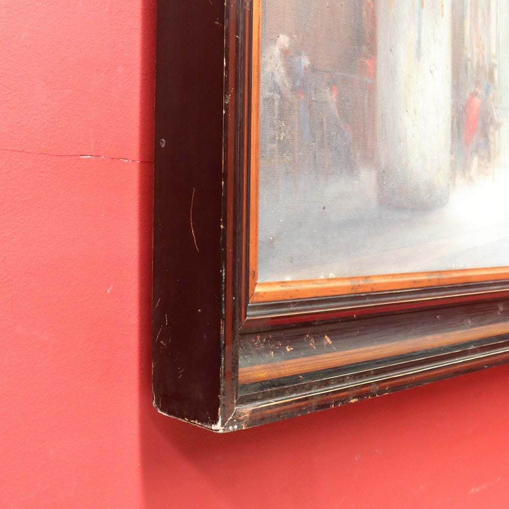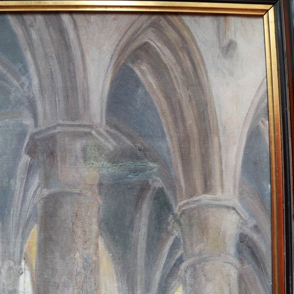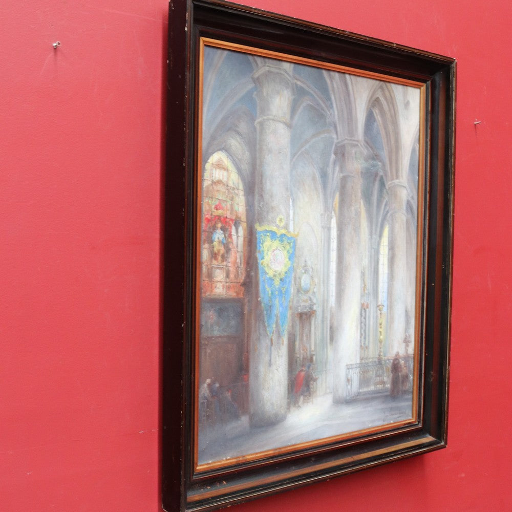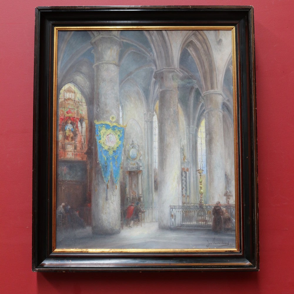 Description: An artwork titled “Cathedral Interior” (also known as “Interior of the Church”) by Belgian artist Jozef Horenbant (1863–1956), believed to depict the interior of a Strasbourg church. Painted with strong architectural detail and atmospheric light. The canvas has a repair, noted for accuracy. Presented in a heavy black and gilt-toned frame and ready to hang. A striking piece by a well-regarded European artist.