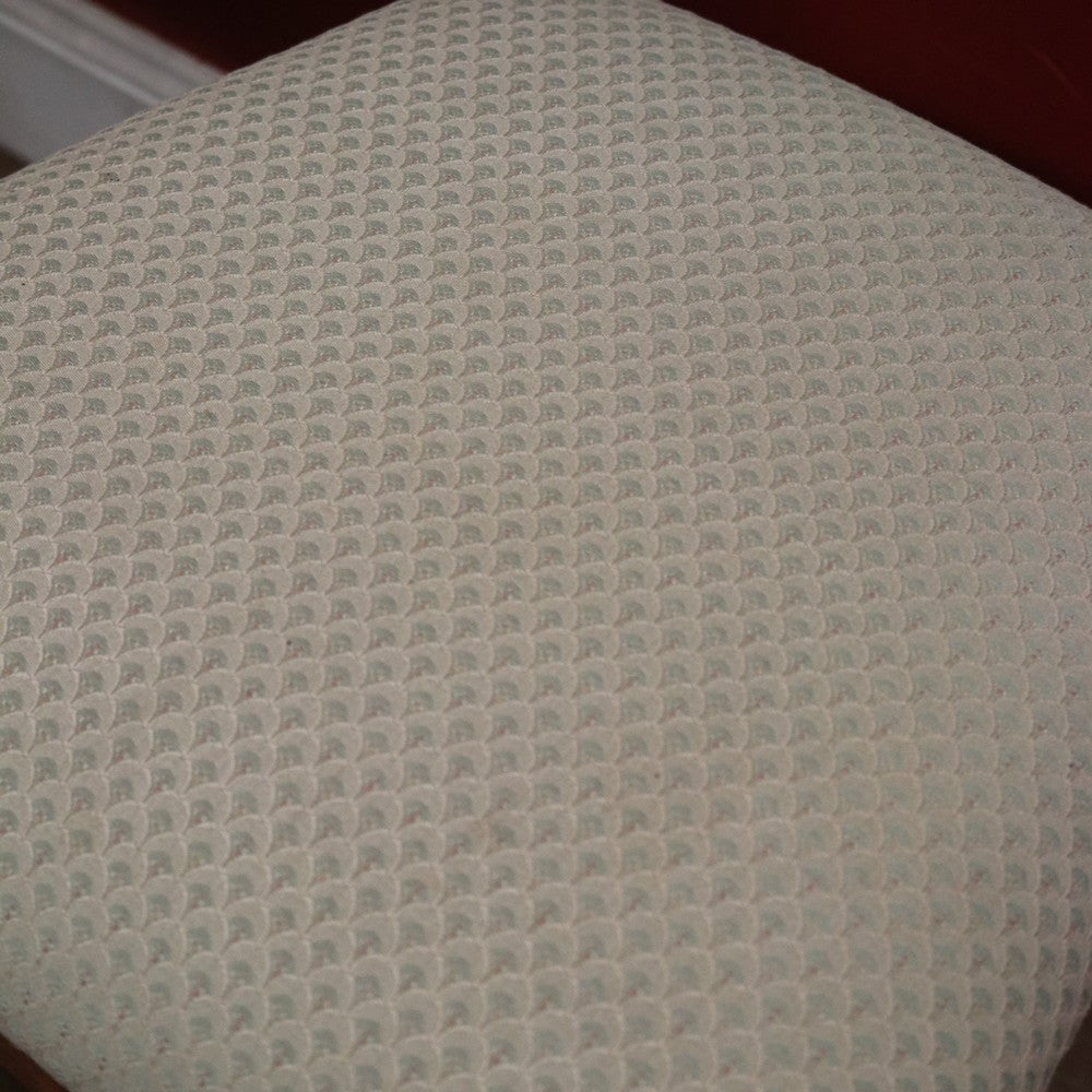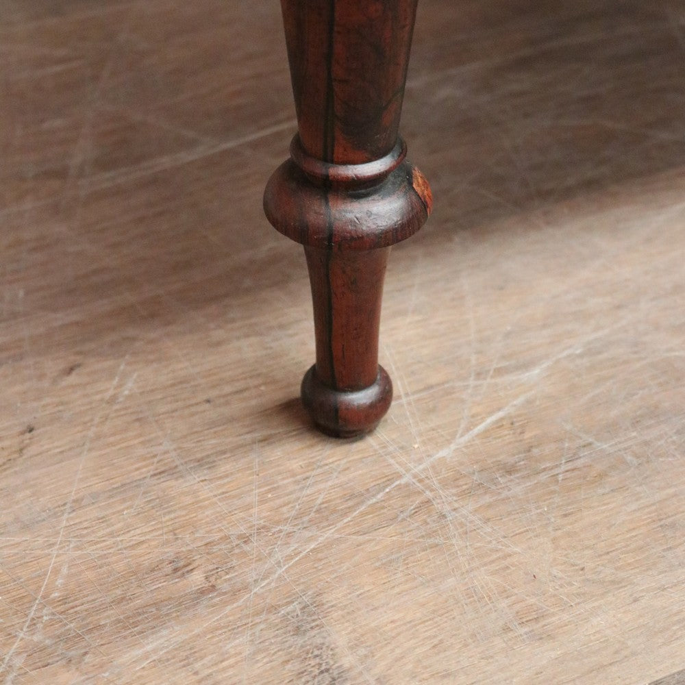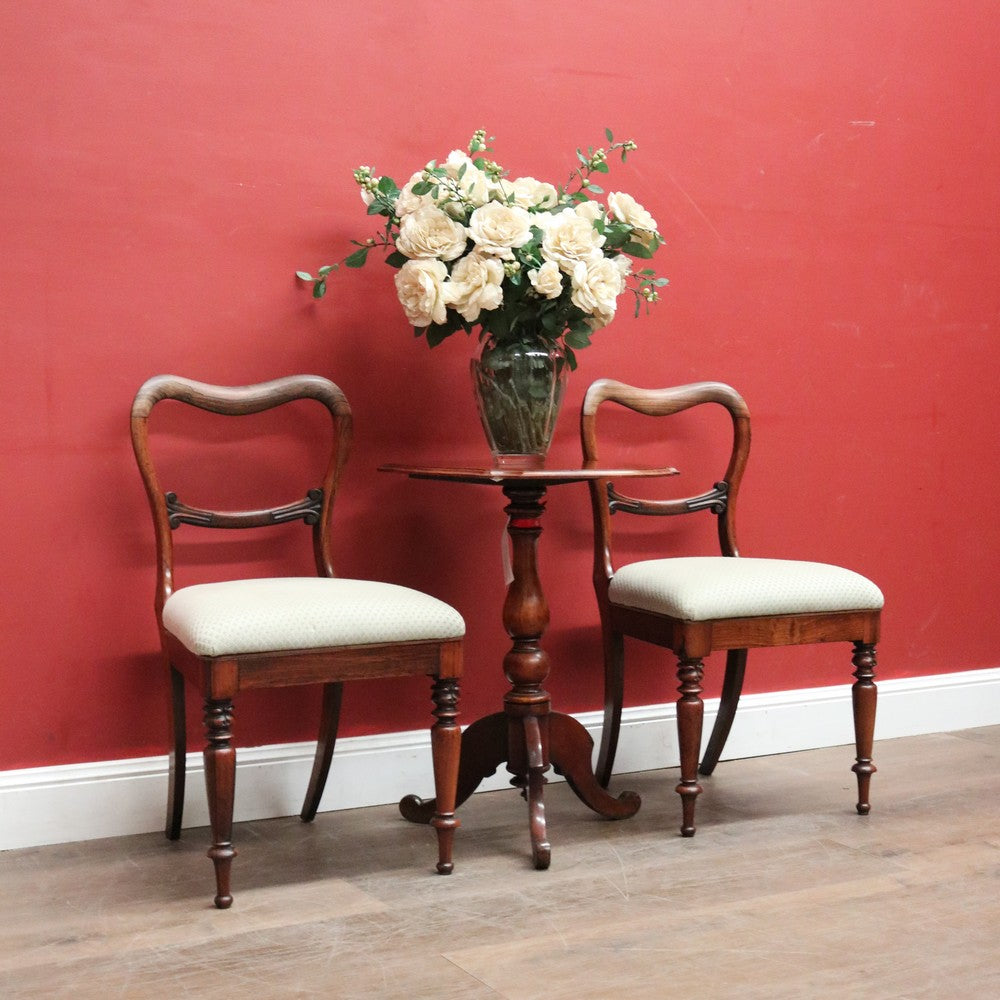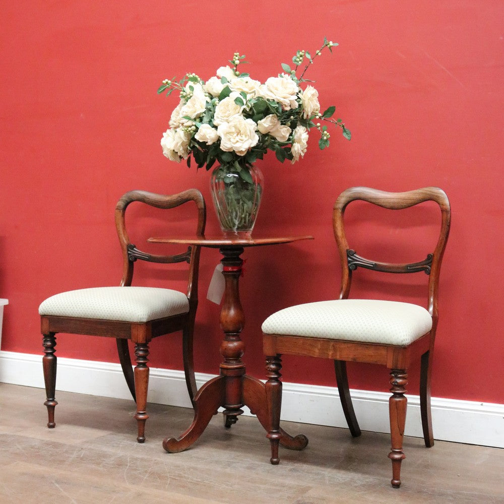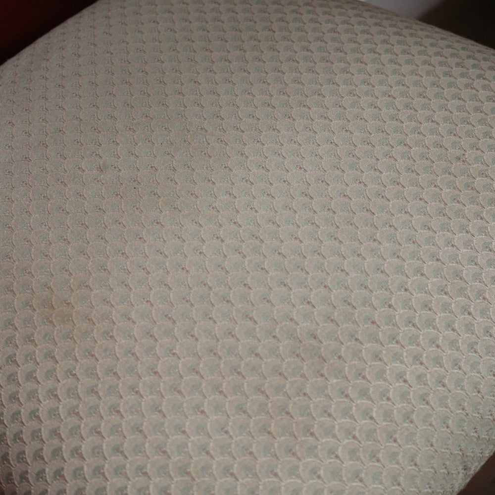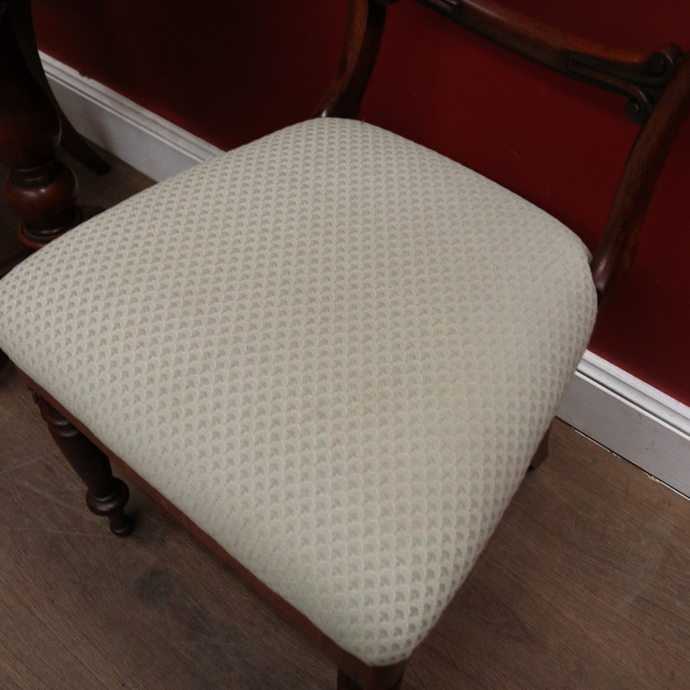 Description: A charming pair of antique English Rosewood chairs, ideal for a hall, bedroom, or any space in need of elegance. Upholstered in soft mint green fabric with a subtle scale pattern and delicate floral details, each chair features tapered turned legs, padded seats for comfort, and finely carved details at each end of the mid-back rail.