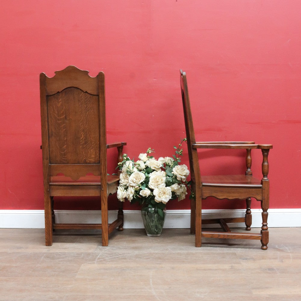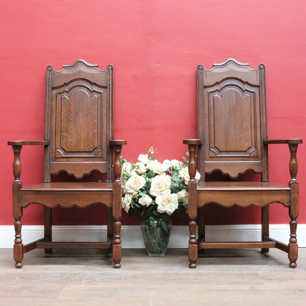 Description: A pair of antique French armchairs with tall, ornate backrests featuring a central panel and elegantly shaped arms. The slightly slanted backs provide comfort, and the chairs are solid, strong and beautifully made.