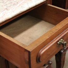 Description French scroll feet with fawn marble tops with rich burgundy, orange and cream veins. Drawer and cupboard storage, French scroll feet. A true pair pair with one being a left and the other a right hand opening.