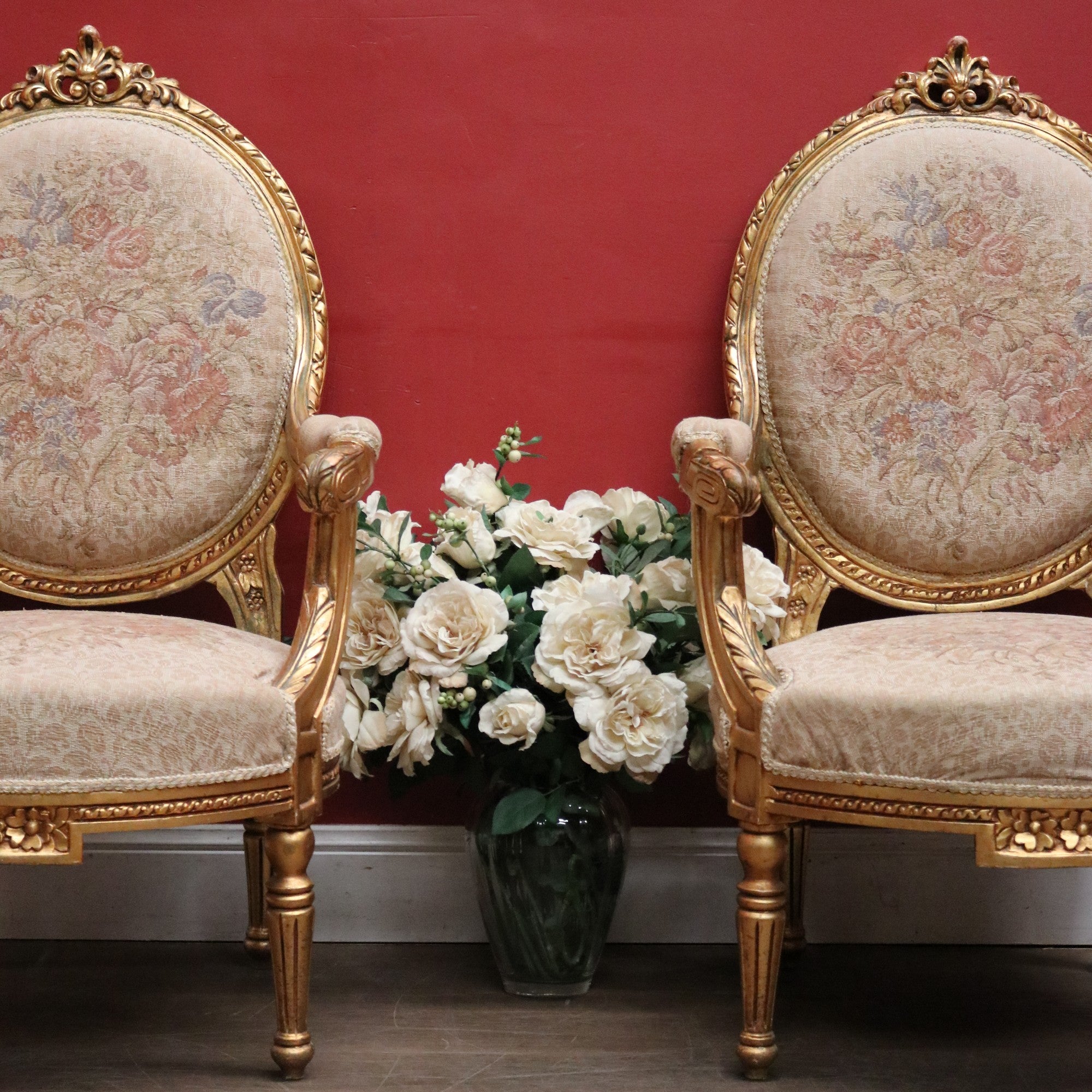 Description: A refined pair of French armchairs, each featuring a classic medallion-shaped back and elegant gilt wood frames. The design is enhanced by tapered reeded legs, bringing balance and sophistication to the form.