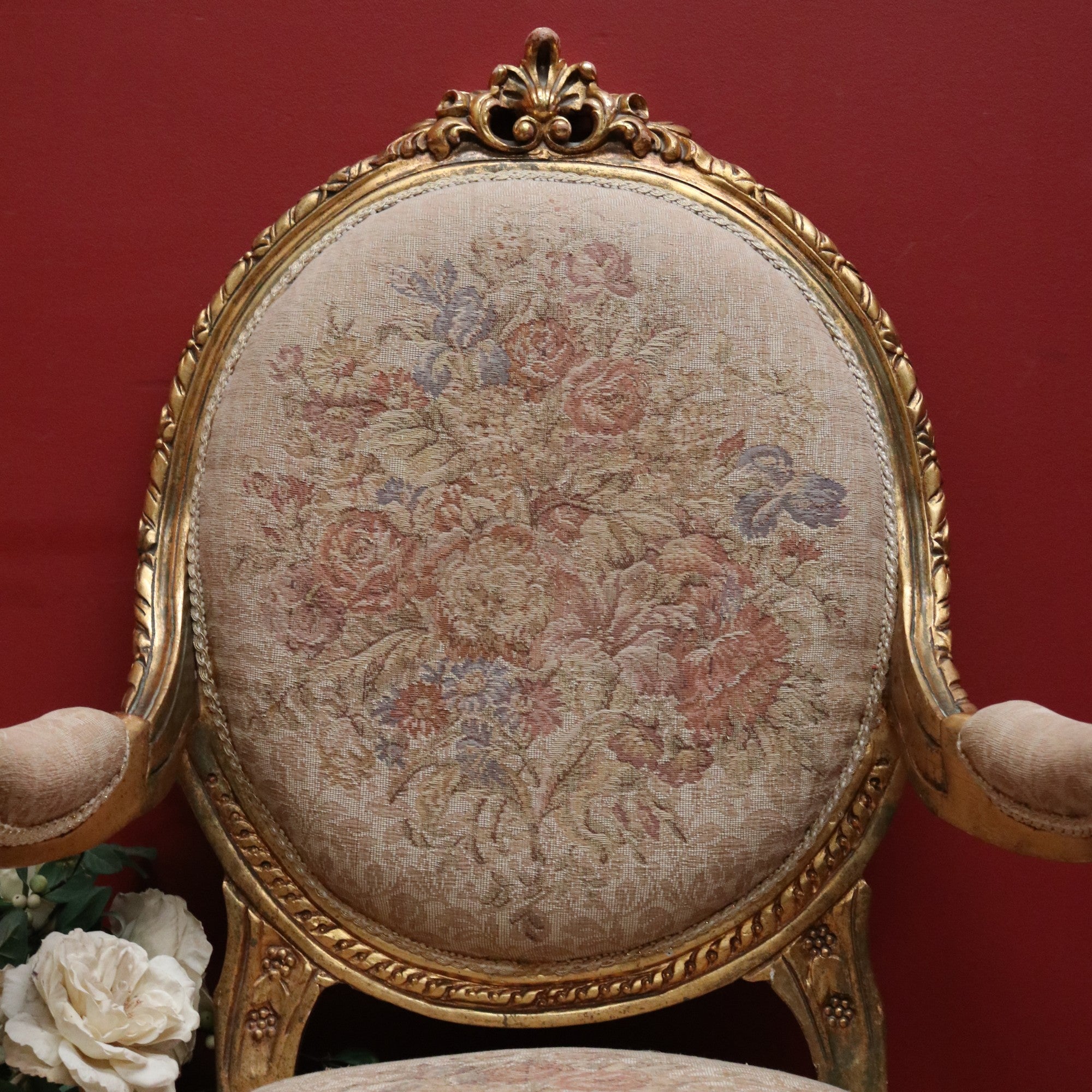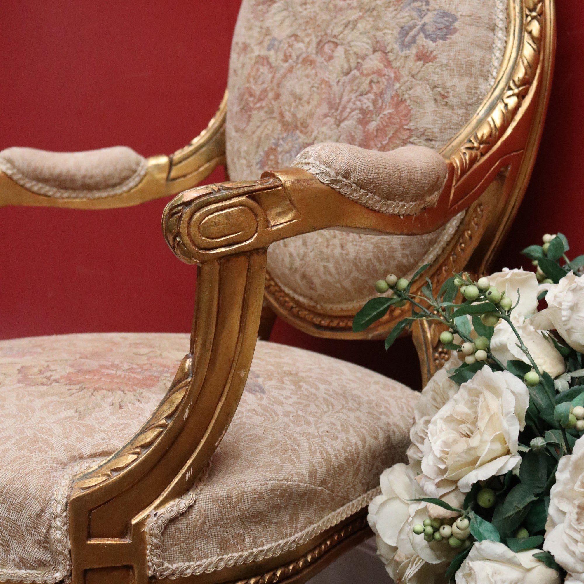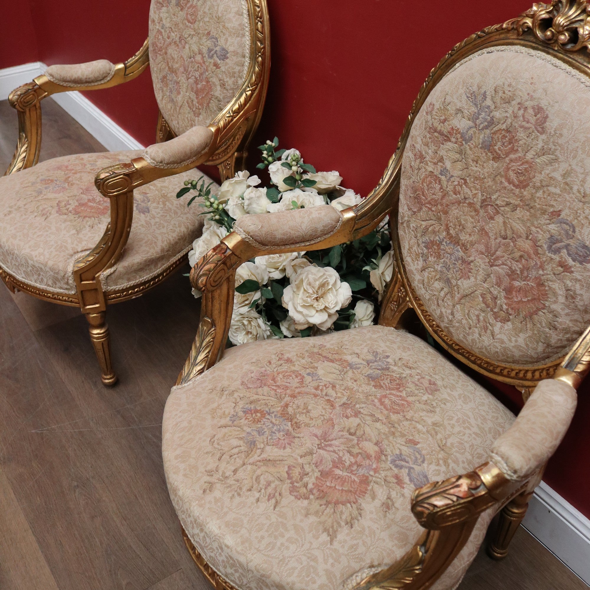 Upholstered in floral tapestry fabric, these chairs combine decorative charm with comfort. The gilt finish shows gentle ageing that highlights their character and authenticity. Perfect as statement pieces in a living room, salon or collector’s interior, they embody the grace and craftsmanship of French design.