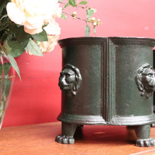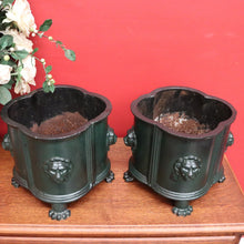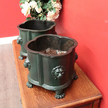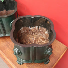 Description A gorgeous set of French heavy cast iron pot planters or Jardinières, four leaf clover in shape. Lion's faces to each side, claw feet and deep emerald in colour.