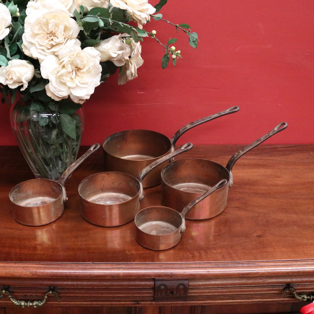 Description: A charming set of five antique French copper saucepans, each with hand-forged cast iron handles and graduating in size. Crafted with traditional French skill, these pans feature a rich aged patina and authentic character. Ideal for display, they can be hung individually in a kitchen or neatly stacked together when not in use. A beautiful addition to any culinary space, or adding a touch of French charm to any space.