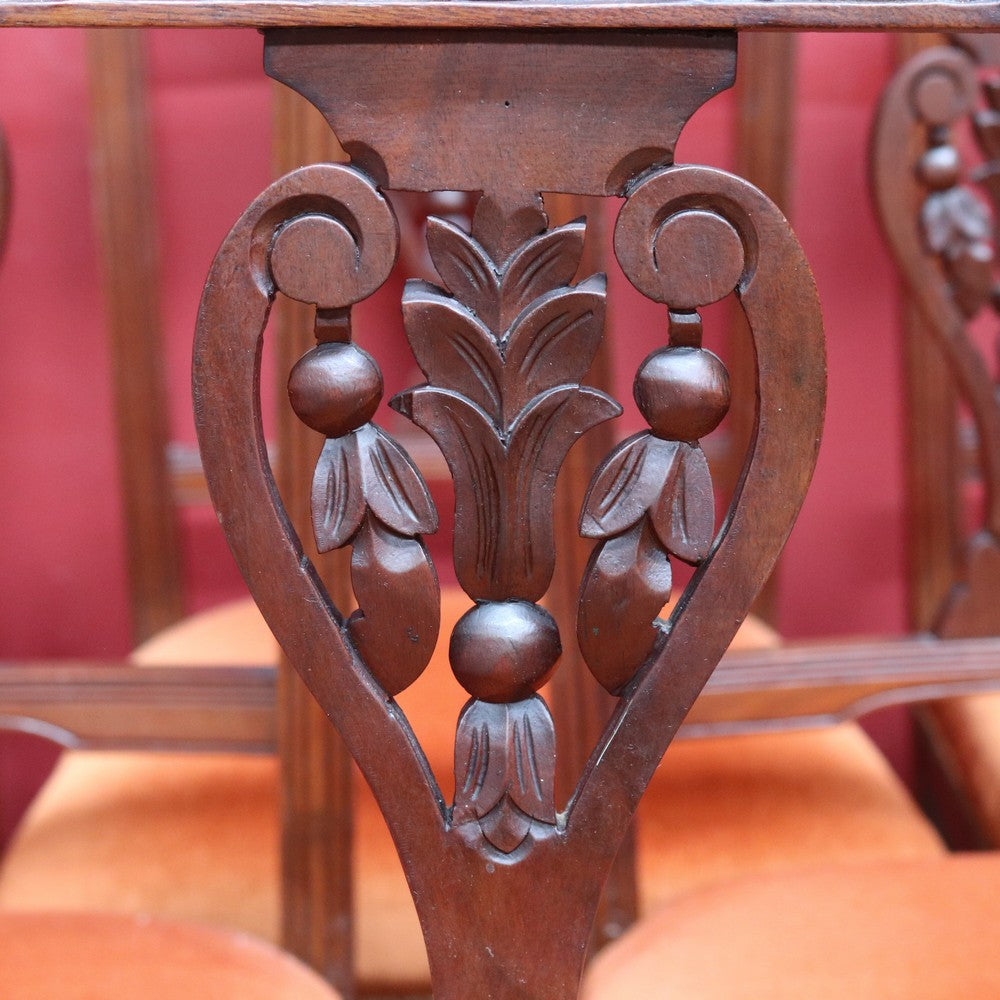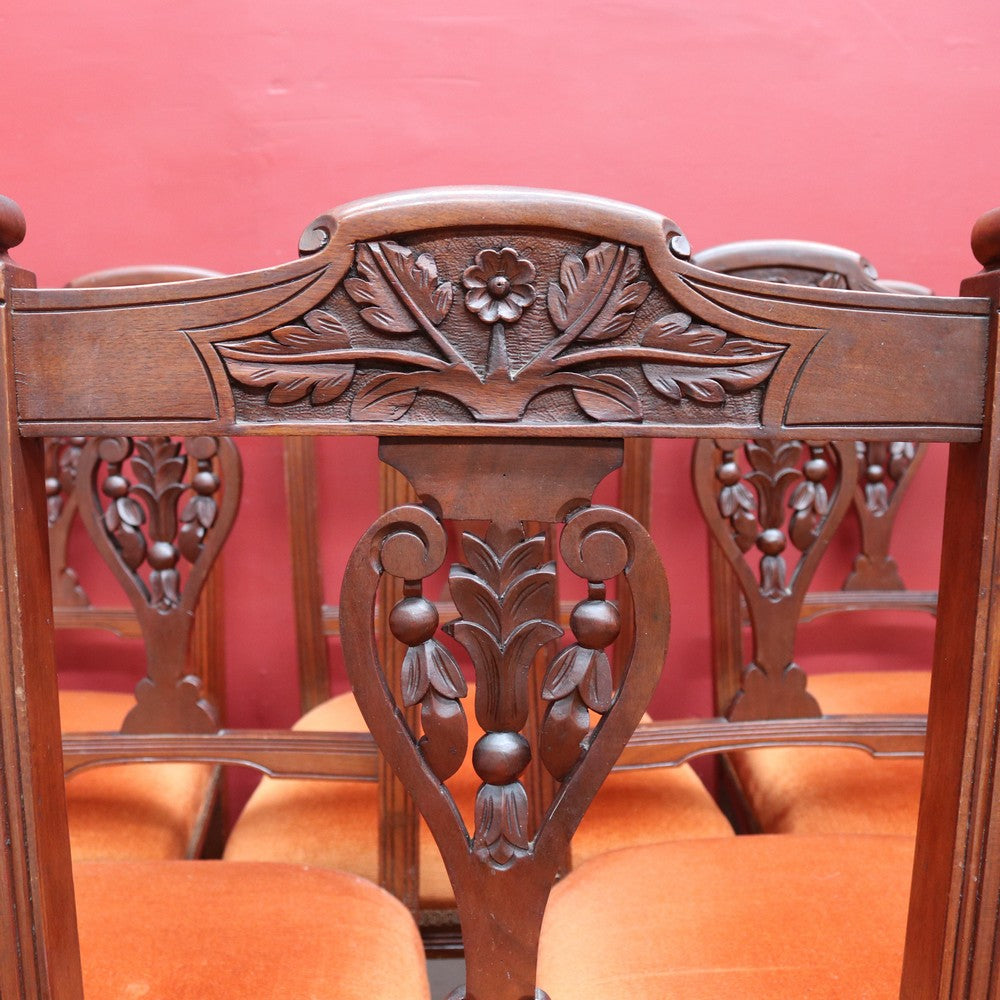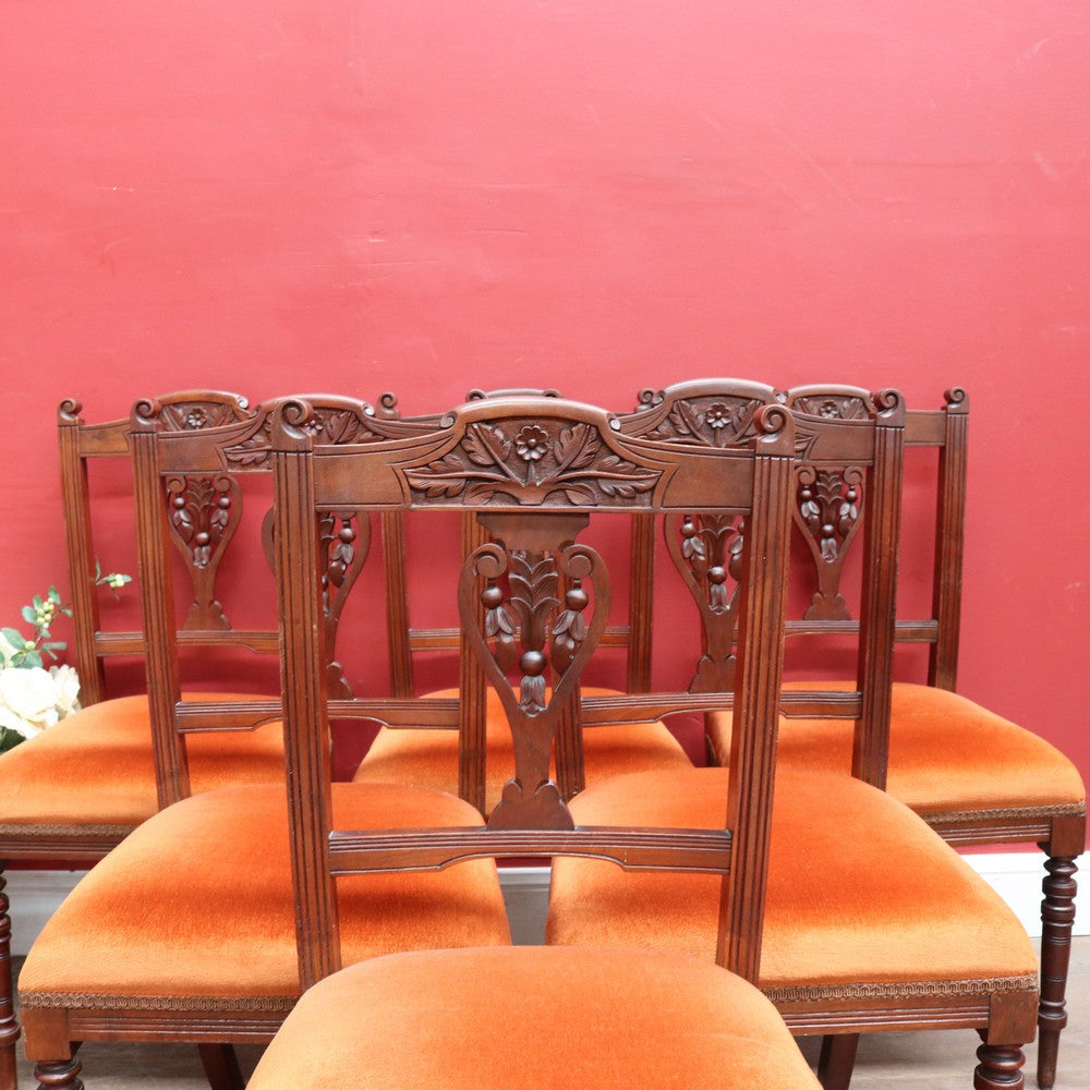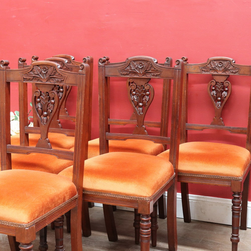 Description: A set of six Australian cedar dining or kitchen chairs, circa 1905, each with foam-padded seats upholstered in a warm burnt-orange fabric. The chairs feature a carved central floral motif, an elegantly shaped top rail, and turned front legs, giving them a refined yet inviting presence.