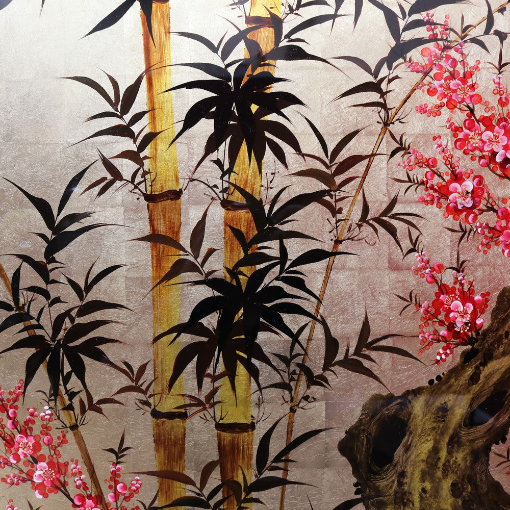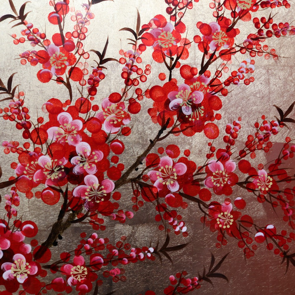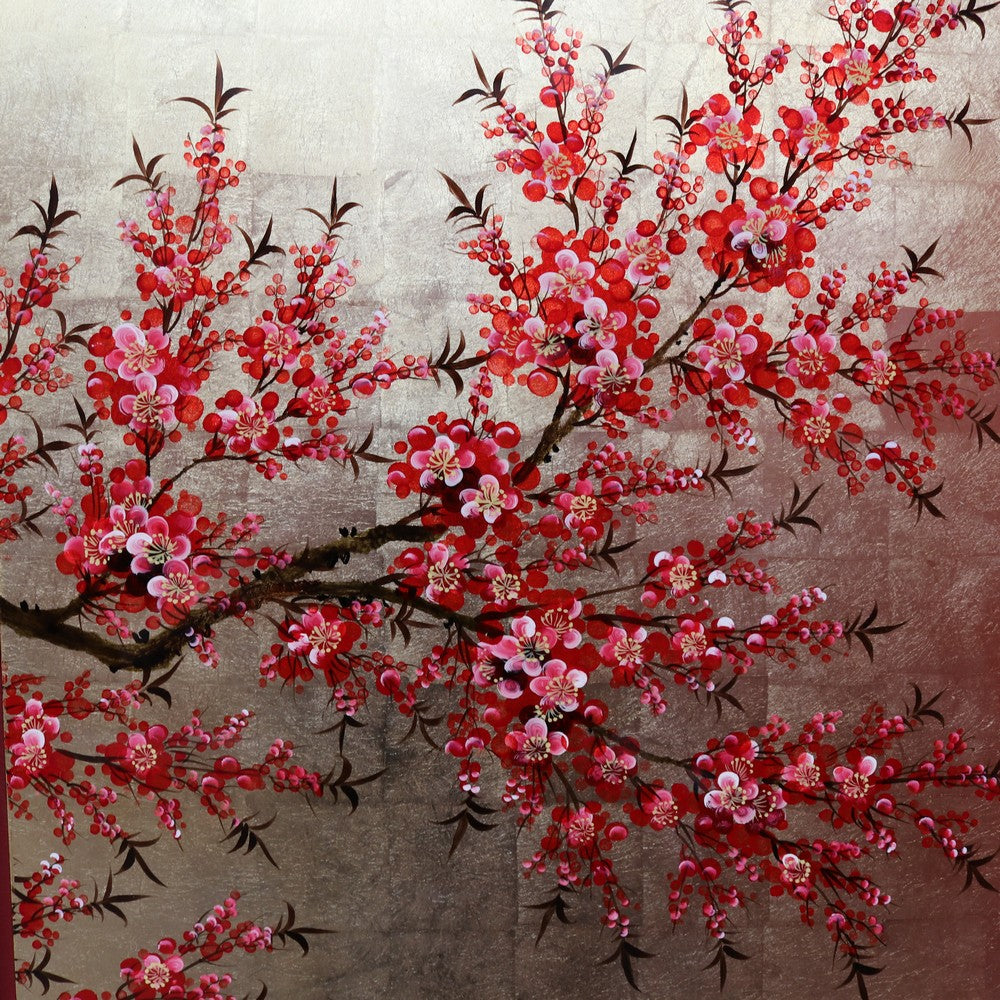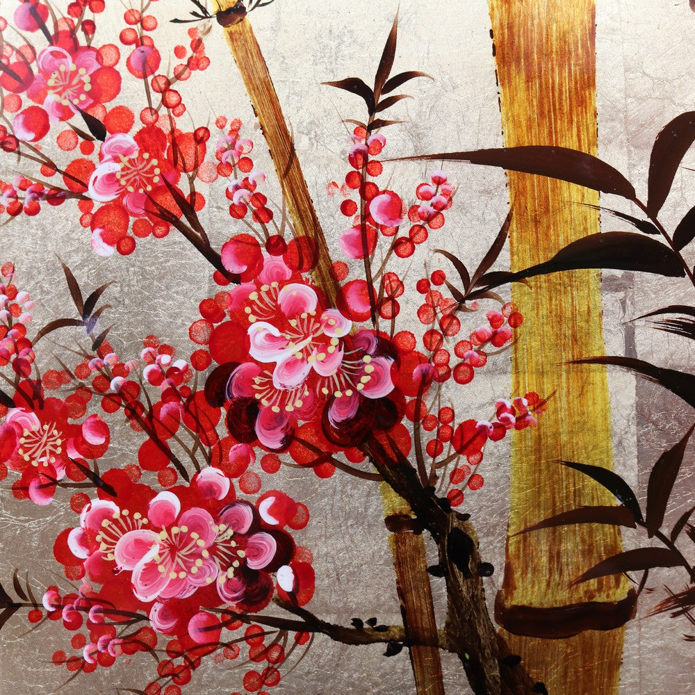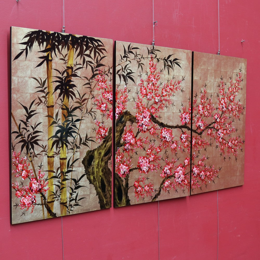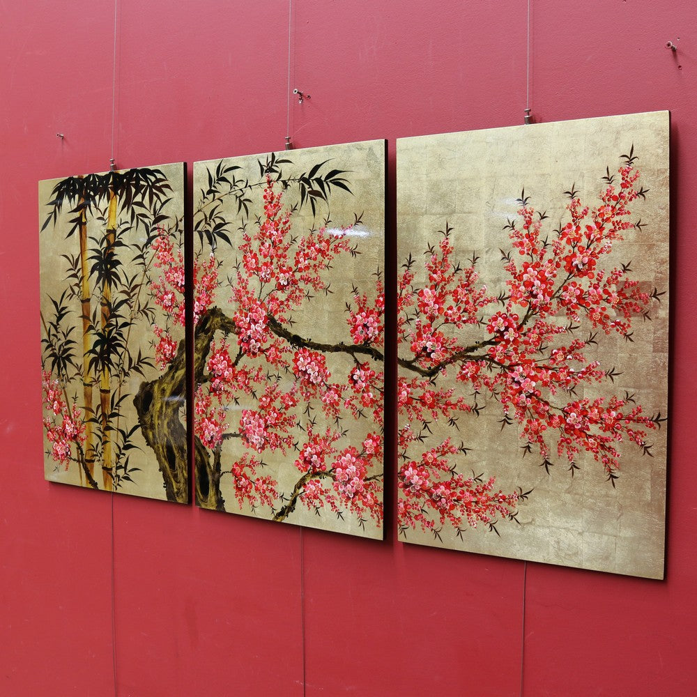 Description: A striking set of three Japanese cherry blossom artworks, each designed to be hung individually while forming a beautiful, unified display when grouped together. The panels feature hand-painted cherry blossom and bamboo leaves over gold leaf squares, finished with a lacquered top that enhances the depth and colour. The set is ready to hang and are in exceptional condition, with bright, vibrant tones that make a stunning statement on any wall.