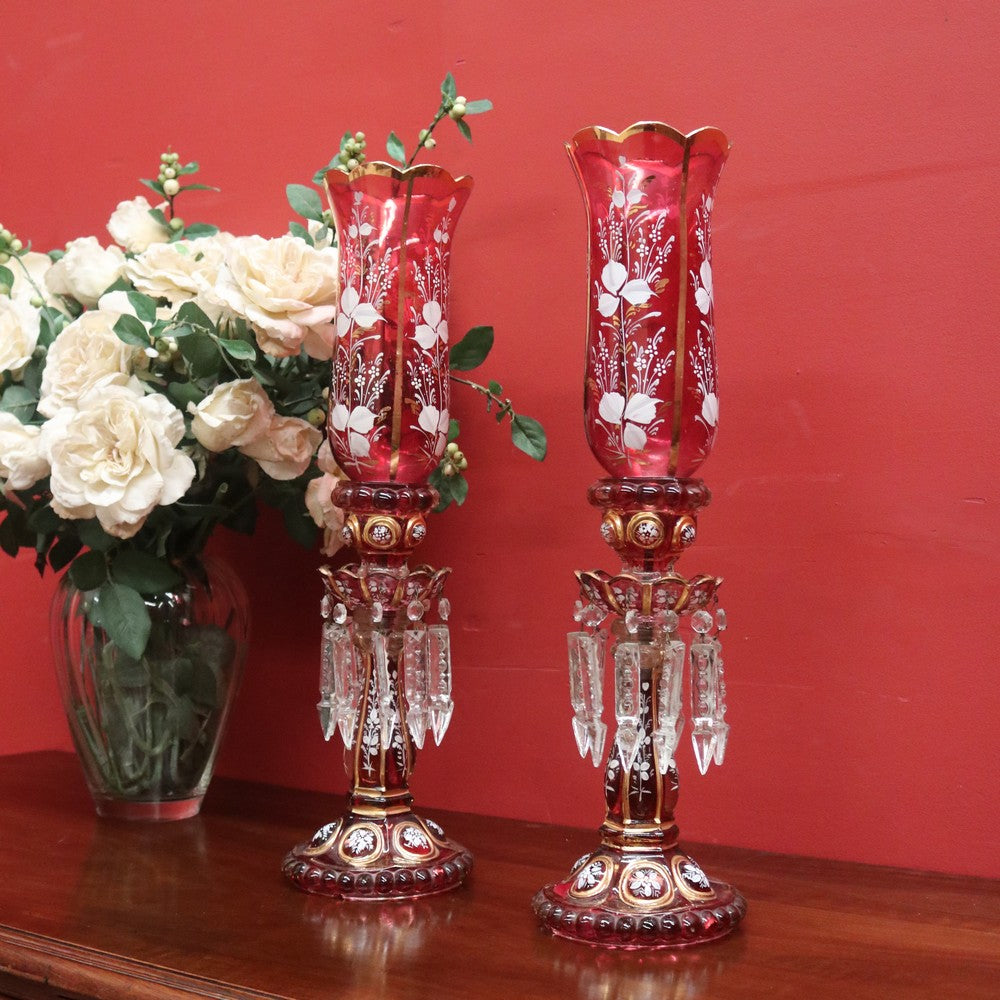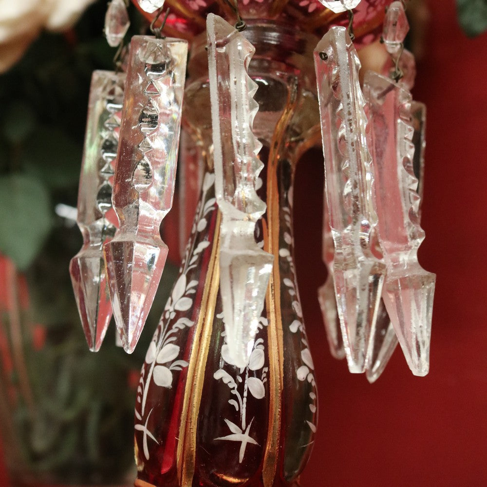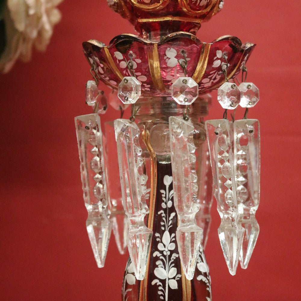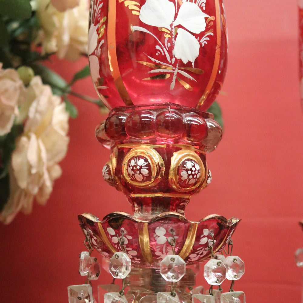 Description: A magnificent pair of antique ruby and clear glass hurricane lamps or mantle lustres. Each features hand-painted floral decoration to the ruby bulbs and gilded oval panels on the base, showcasing finely detailed painted scenes. Adorning each lamp are hand-formed glass prism drops that shimmer beautifully in the light. Elegant, decorative, and rare, these pieces make a stunning statement on any mantel or sideboard.