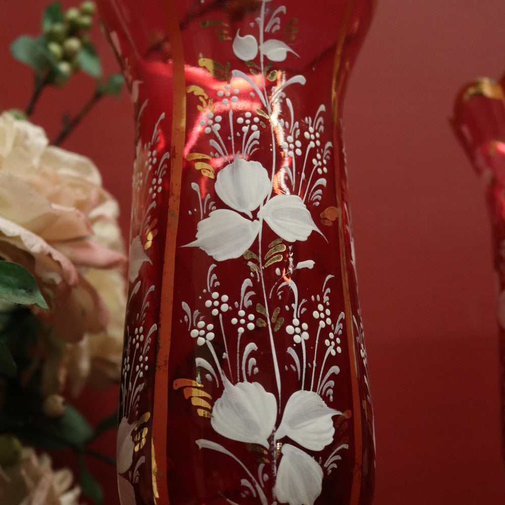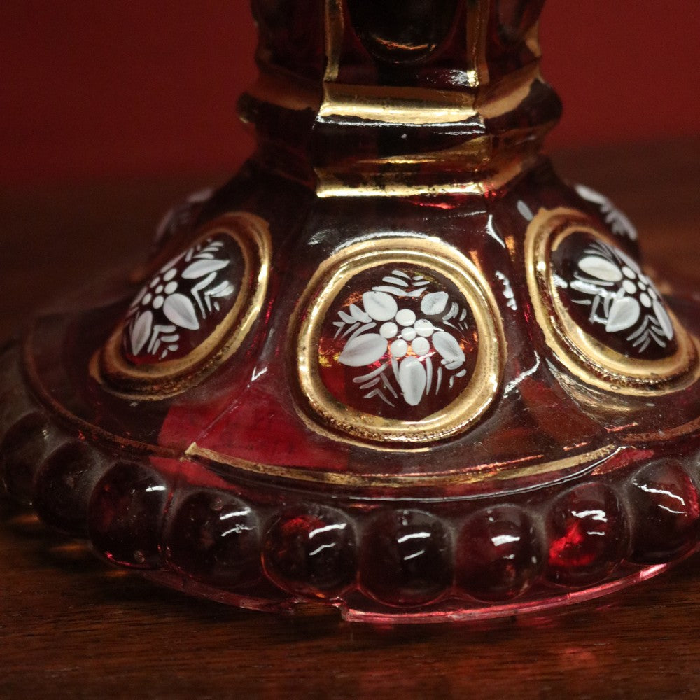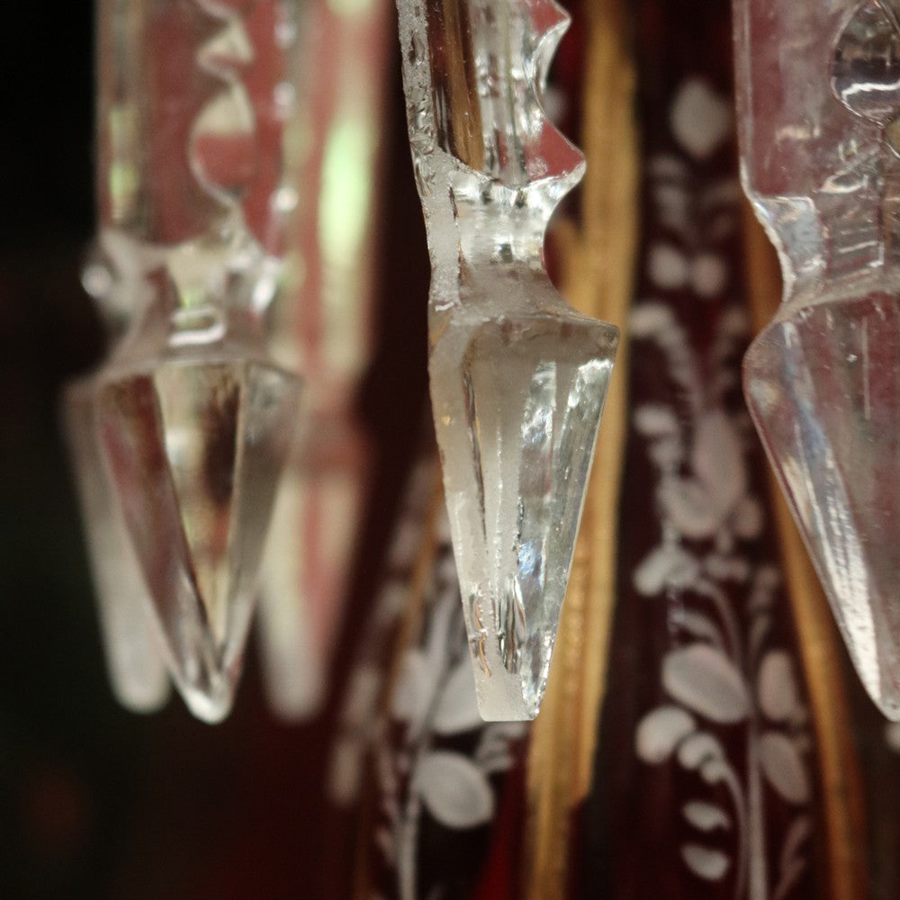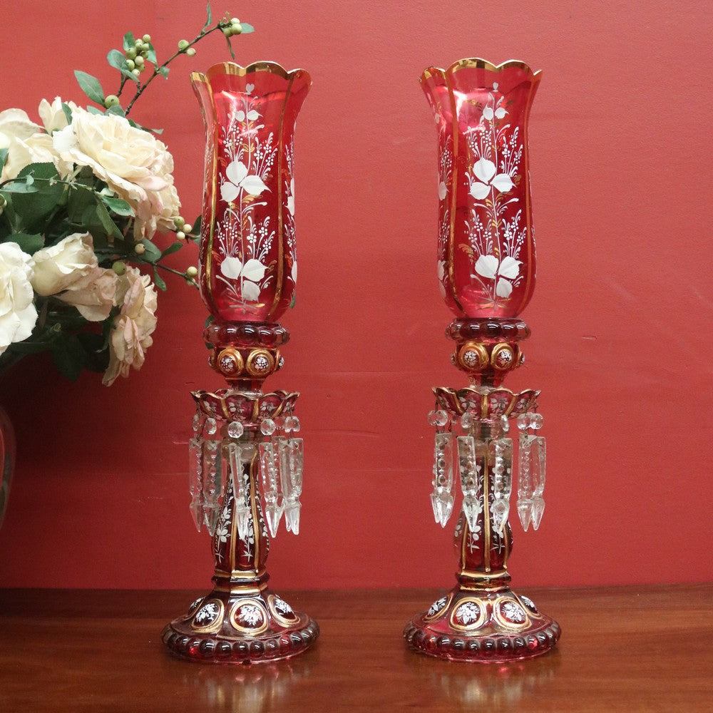 Description: A magnificent pair of antique ruby and clear glass hurricane lamps or mantle lustres. Each features hand-painted floral decoration to the ruby bulbs and gilded oval panels on the base, showcasing finely detailed painted scenes. Adorning each lamp are hand-formed glass prism drops that shimmer beautifully in the light. Elegant, decorative, and rare, these pieces make a stunning statement on any mantel or sideboard.