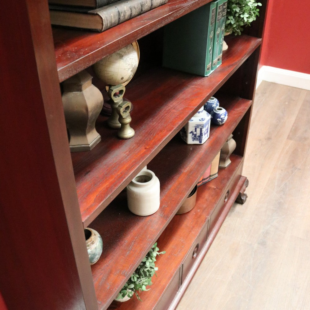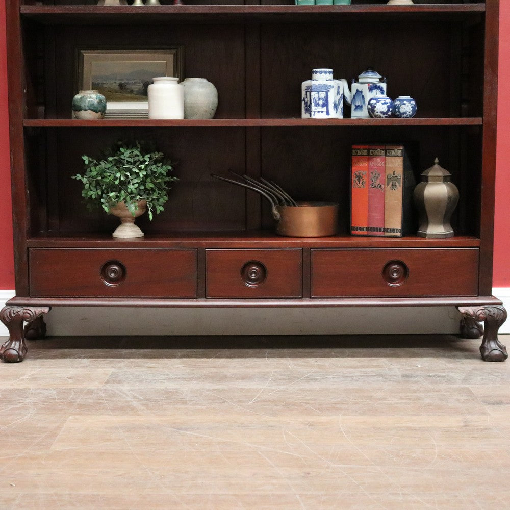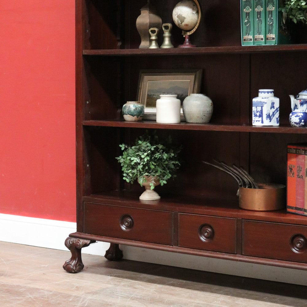 Description: Vintage Australian cedar bookcase featuring four adjustable shelves, three drawers with recessed handles to the base, and decorative carved feet and corbels. A narrow, versatile piece that fits easily into any space, offering both storage and display.