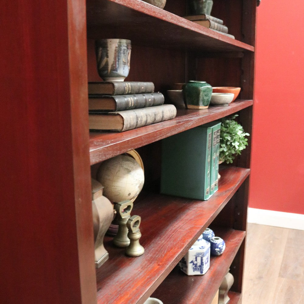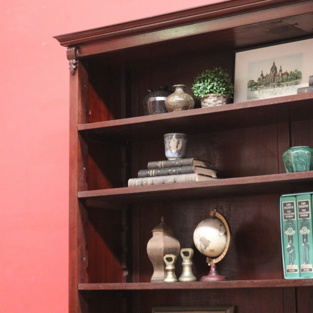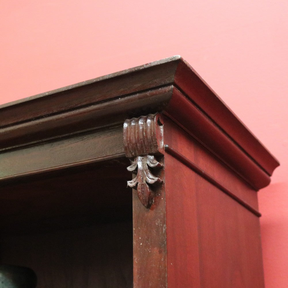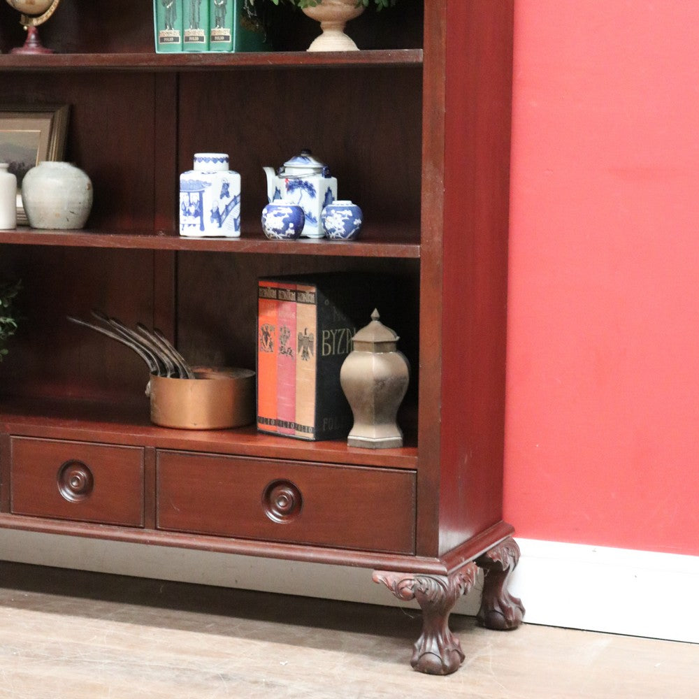Description: Vintage Australian cedar bookcase featuring four adjustable shelves, three drawers with recessed handles to the base, and decorative carved feet and corbels. A narrow, versatile piece that fits easily into any space, offering both storage and display.