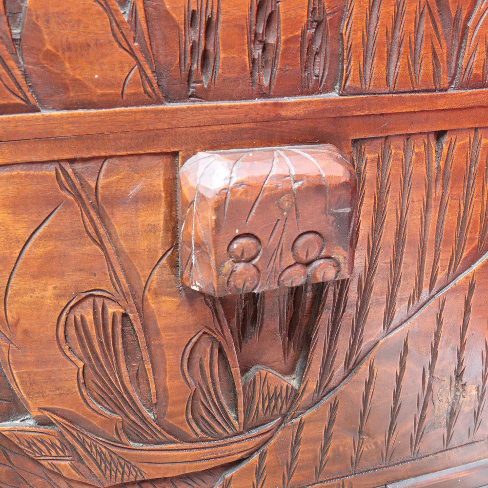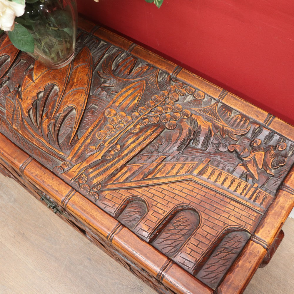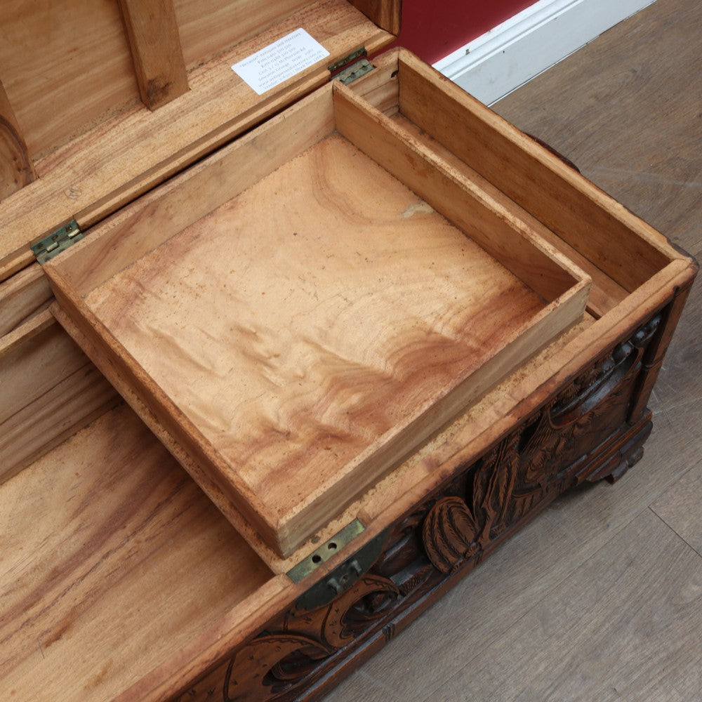 Description: Vintage camphor wood box with Chinese-inspired carved decoration and a bamboo-look edge detail. The box features a brass latch, an internal candle compartment on the right-hand side, and a sliding tray for added storage. The carved scene on the lid is finely executed, showing depth and texture typical of camphor work. A well-made, aromatic timber box with practical internal sections.