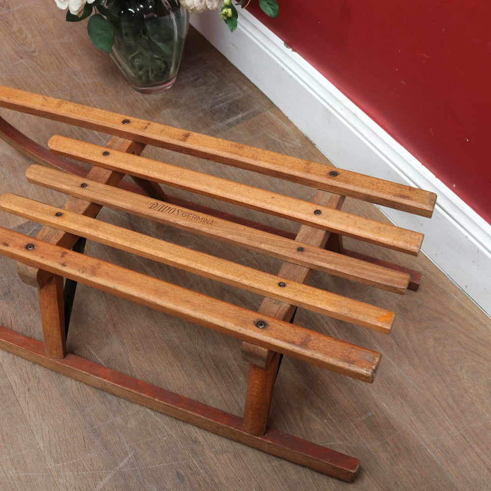 Description: Vintage timber child’s sleigh made in Germany by Davos Germina, marked Made in G.D.R. Beautifully crafted with a rich patina and in excellent condition for its age.