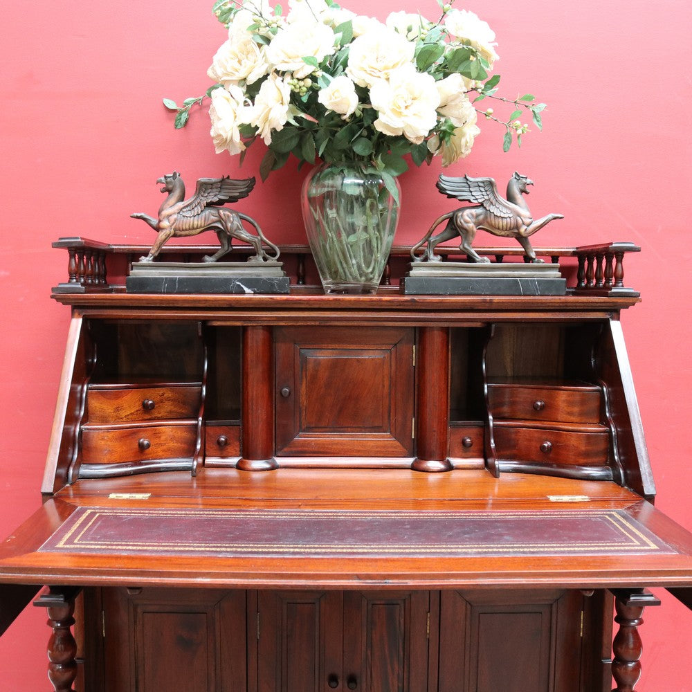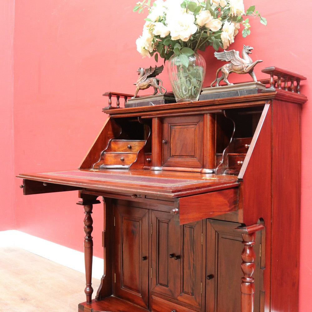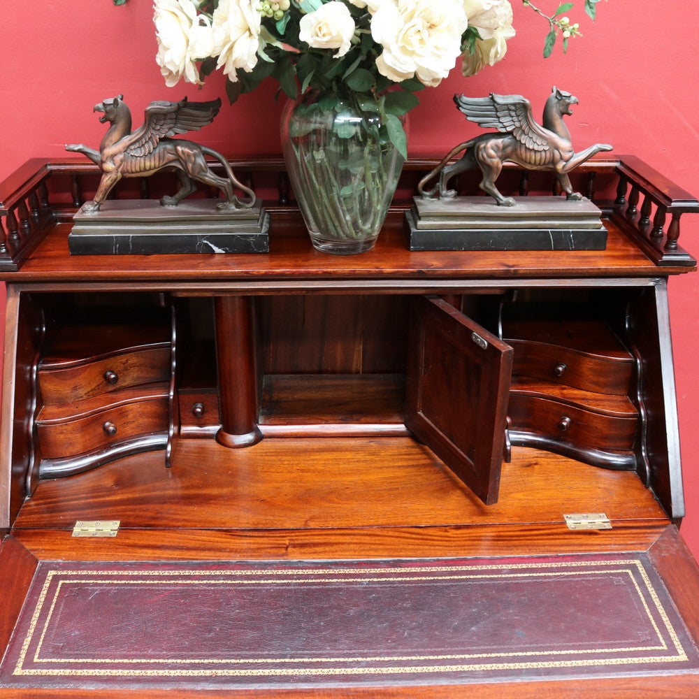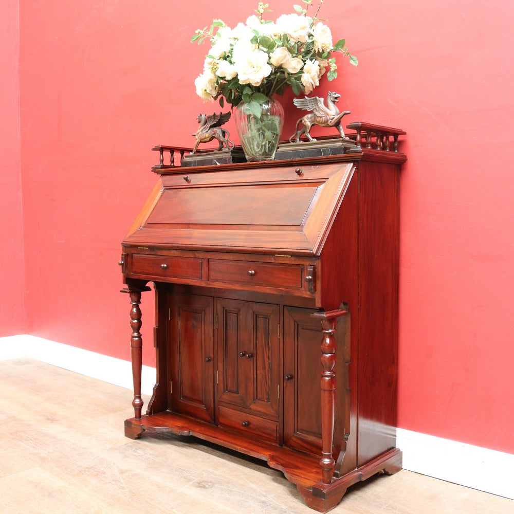 Description: A vintage mahogany writing desk or bureau with a classic colonial Victorian appeal. The drop-front desk opens to reveal a beautifully arranged interior fitted with four small trinket drawers, two pen drawers, and two concealed pull-out columns designed for discreet storage.