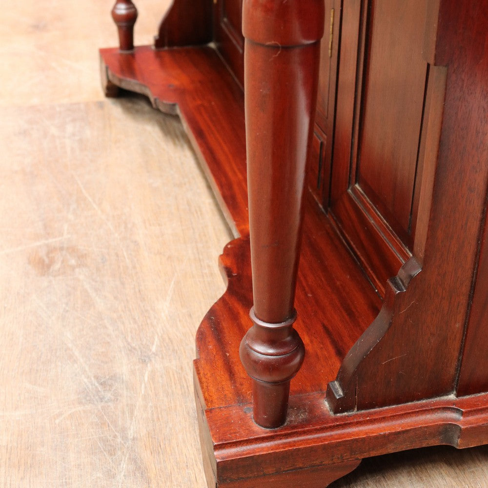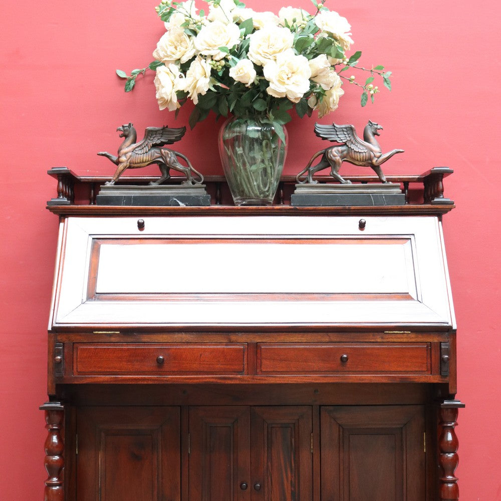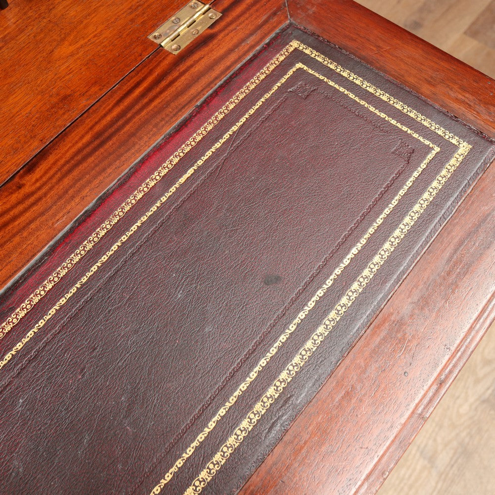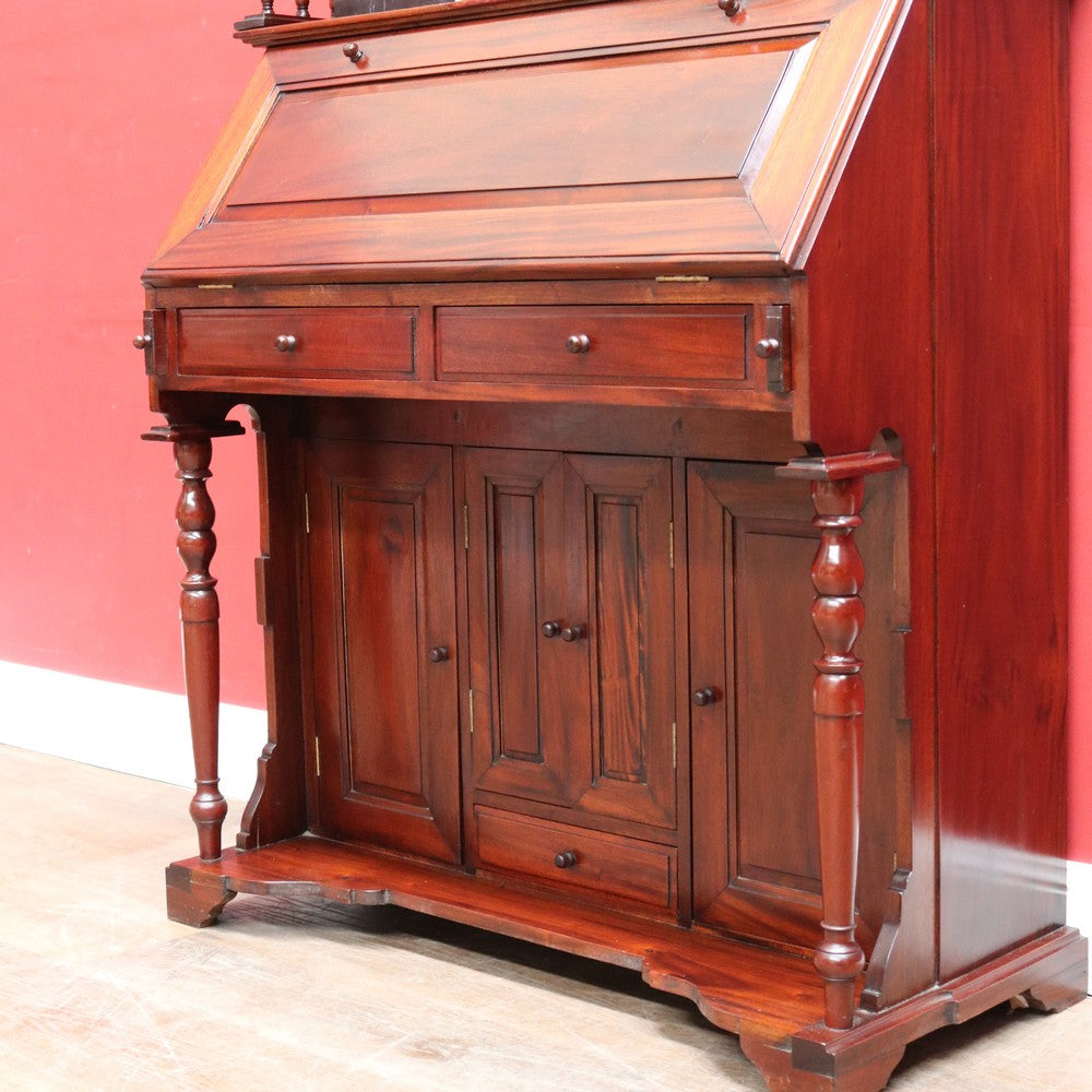 Description: A vintage mahogany writing desk or bureau with a classic colonial Victorian appeal. The drop-front desk opens to reveal a beautifully arranged interior fitted with four small trinket drawers, two pen drawers, and two concealed pull-out columns designed for discreet storage.